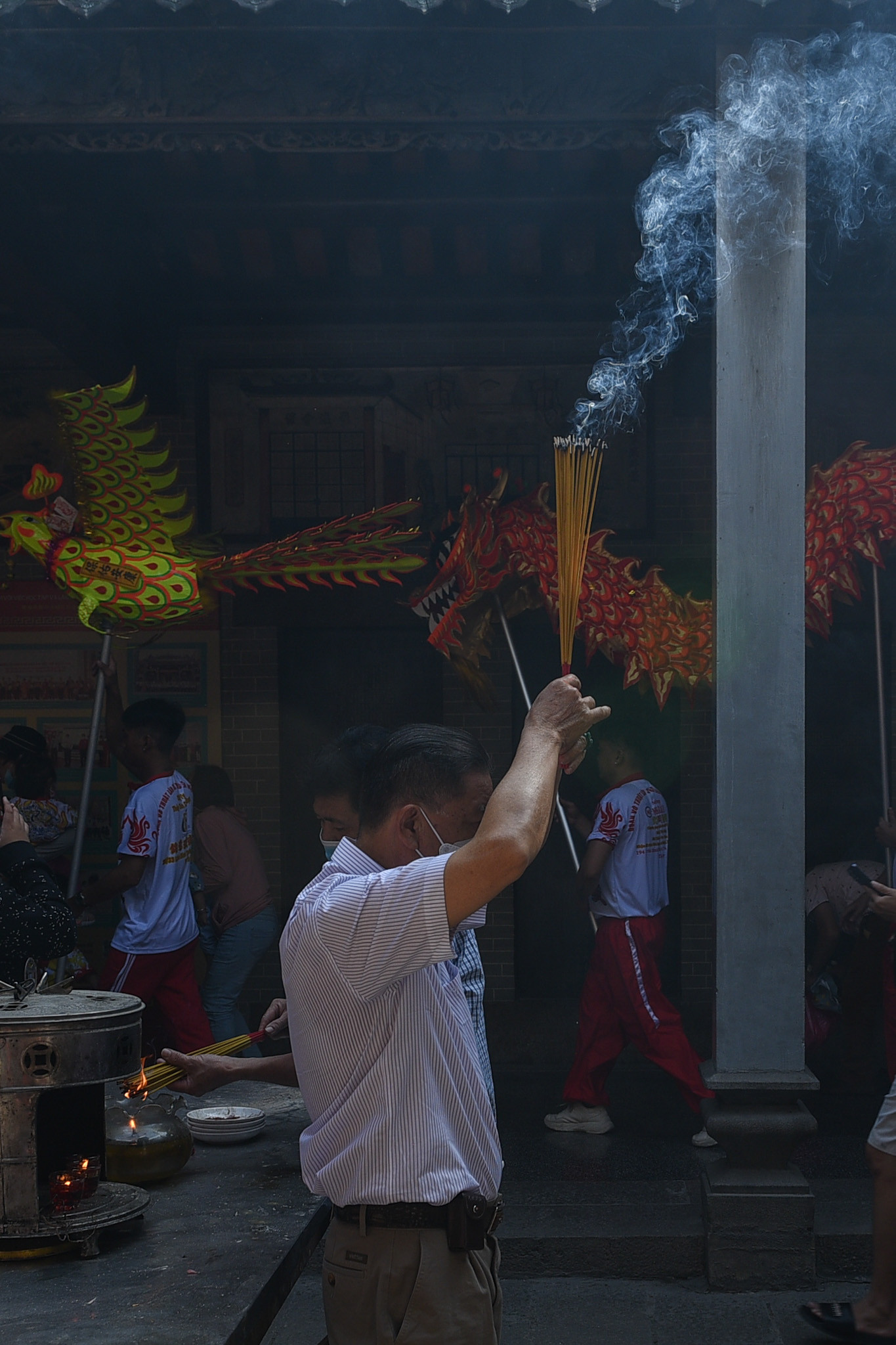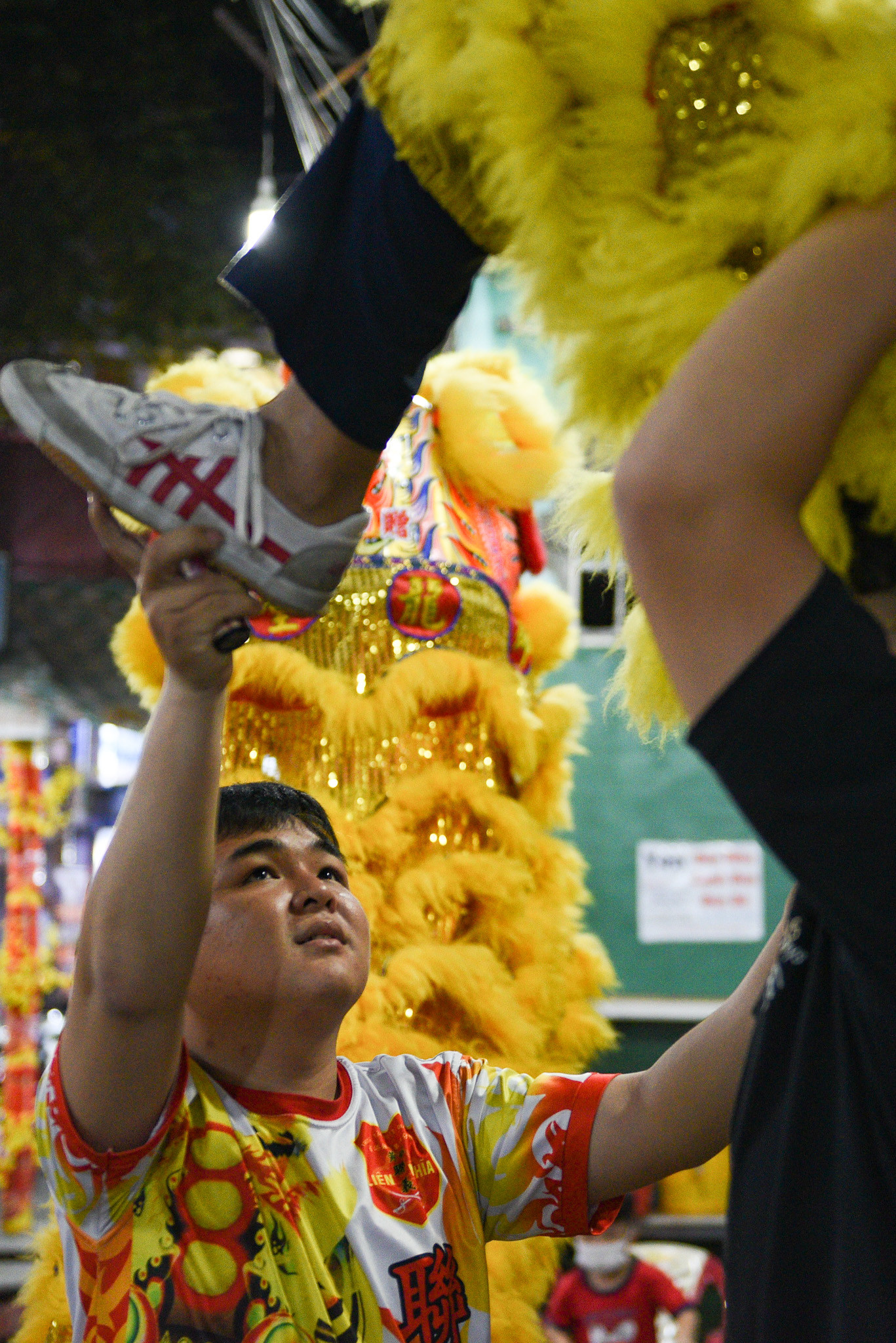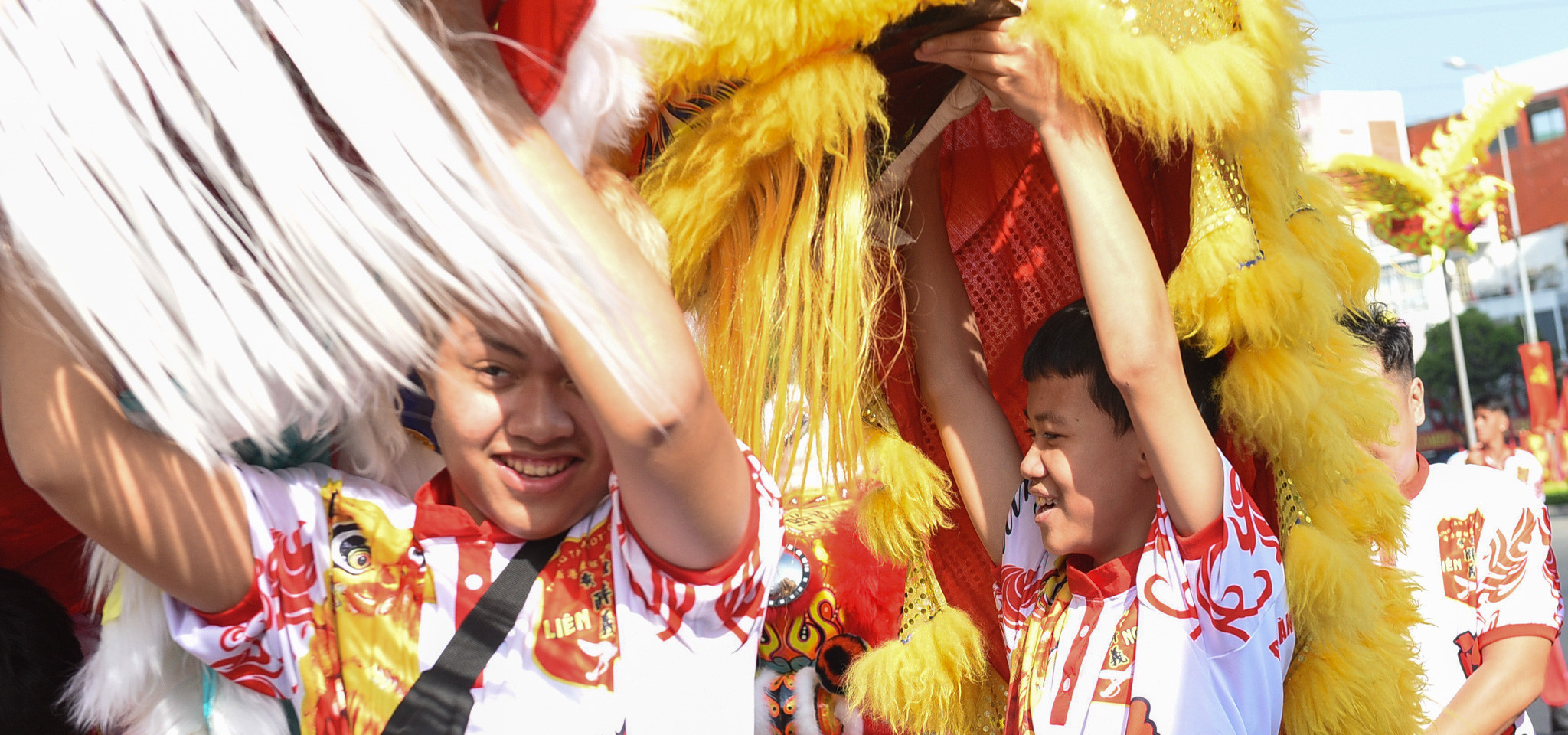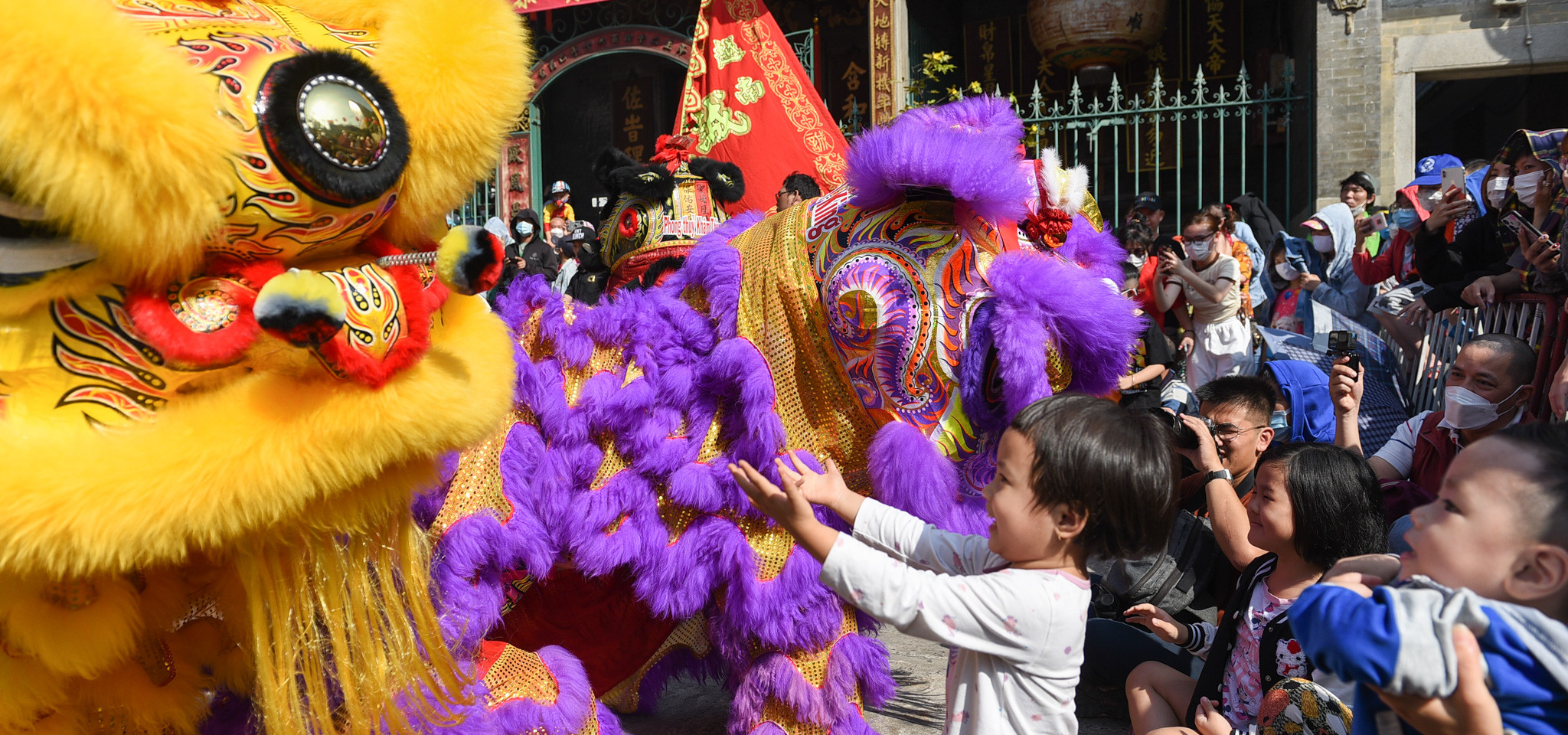 Tại Chùa Bà Thiên Hậu, một số đội lân sư rồng từ những võ quán khác cũng có mặt. Nhiều em nhỏ phấn khích trước các đầu lân sặc sỡ sắc màu.
