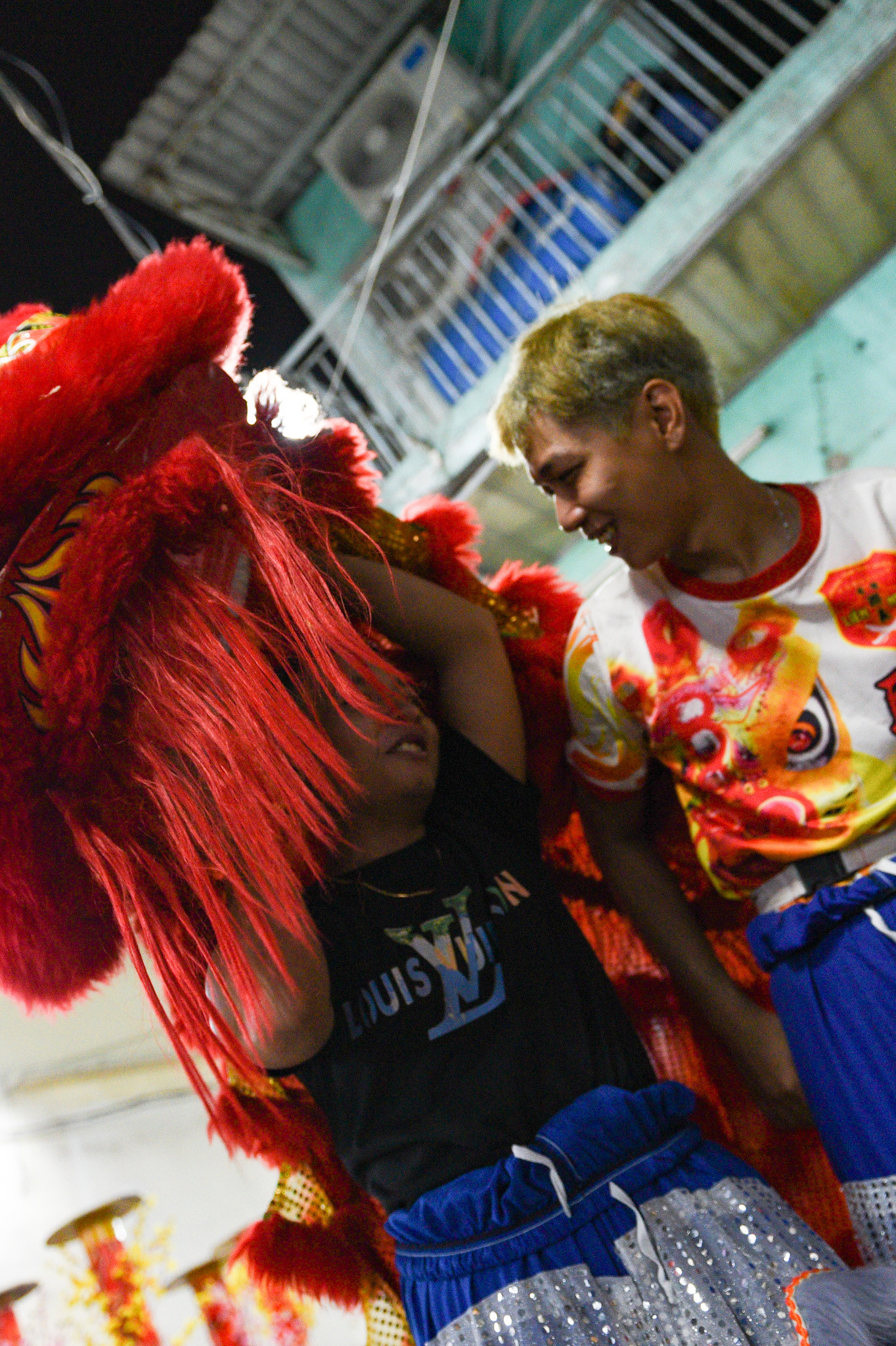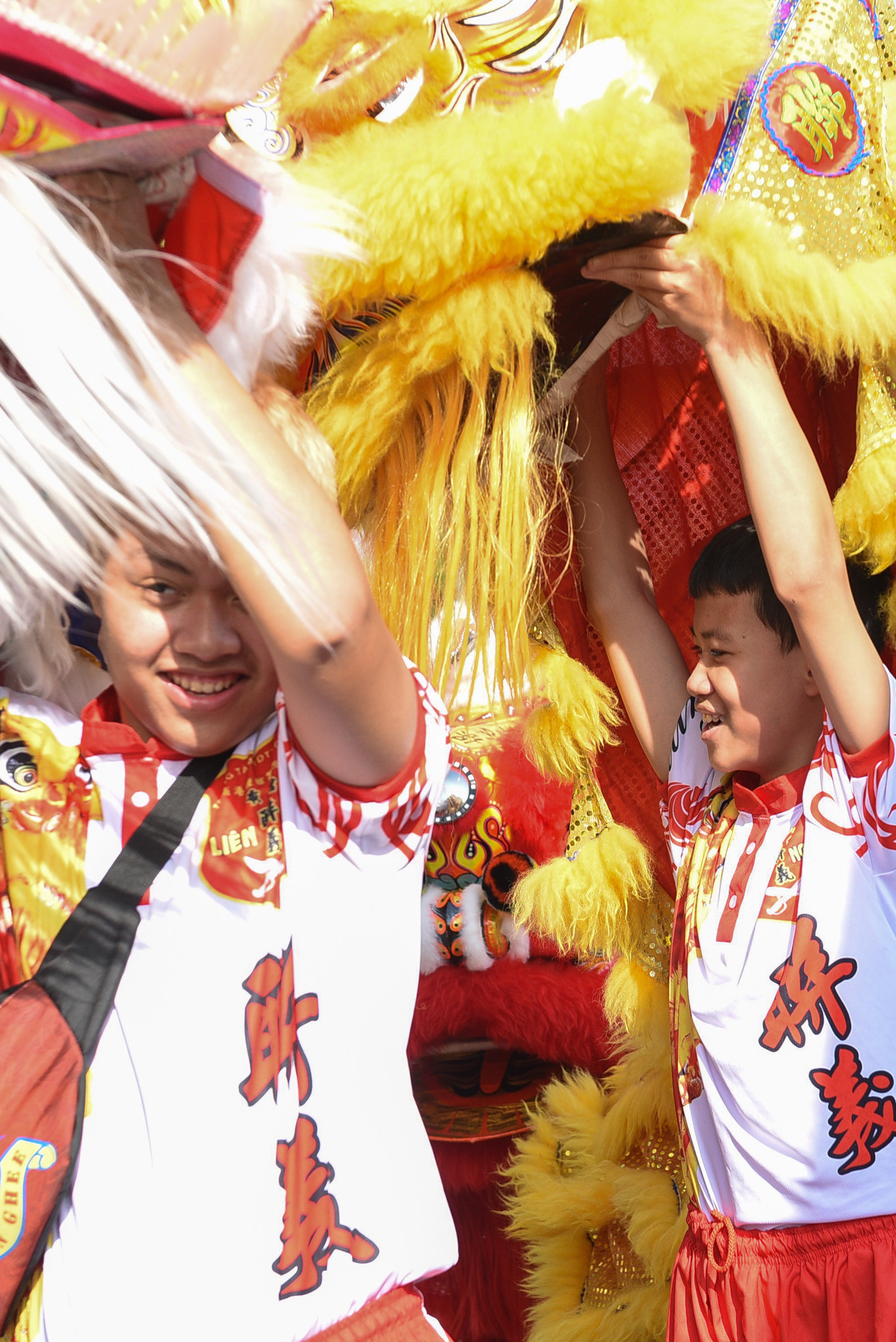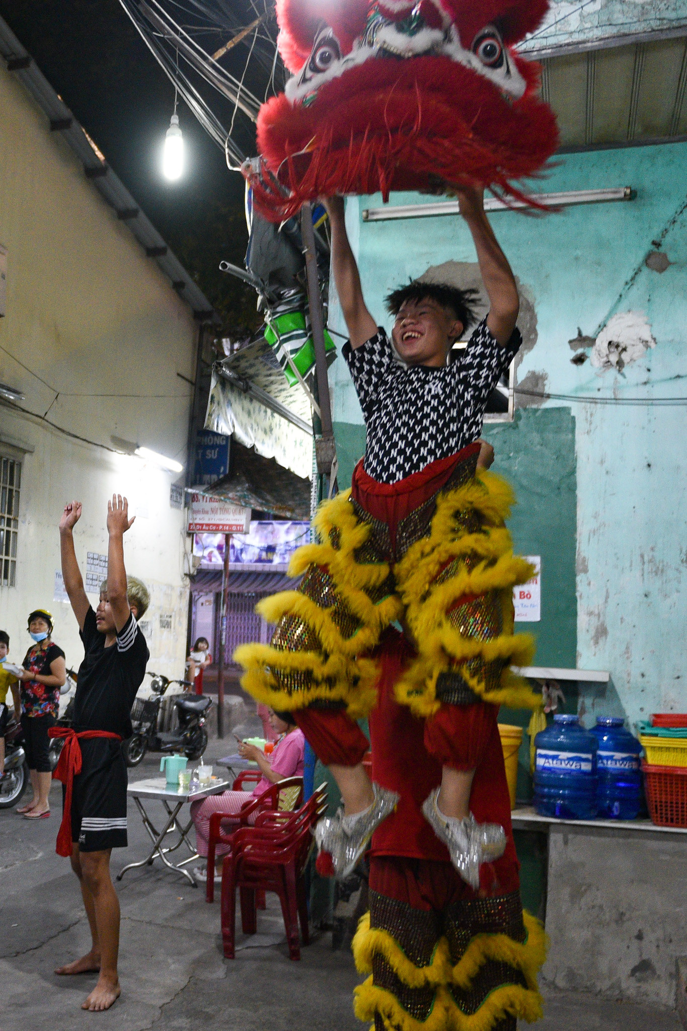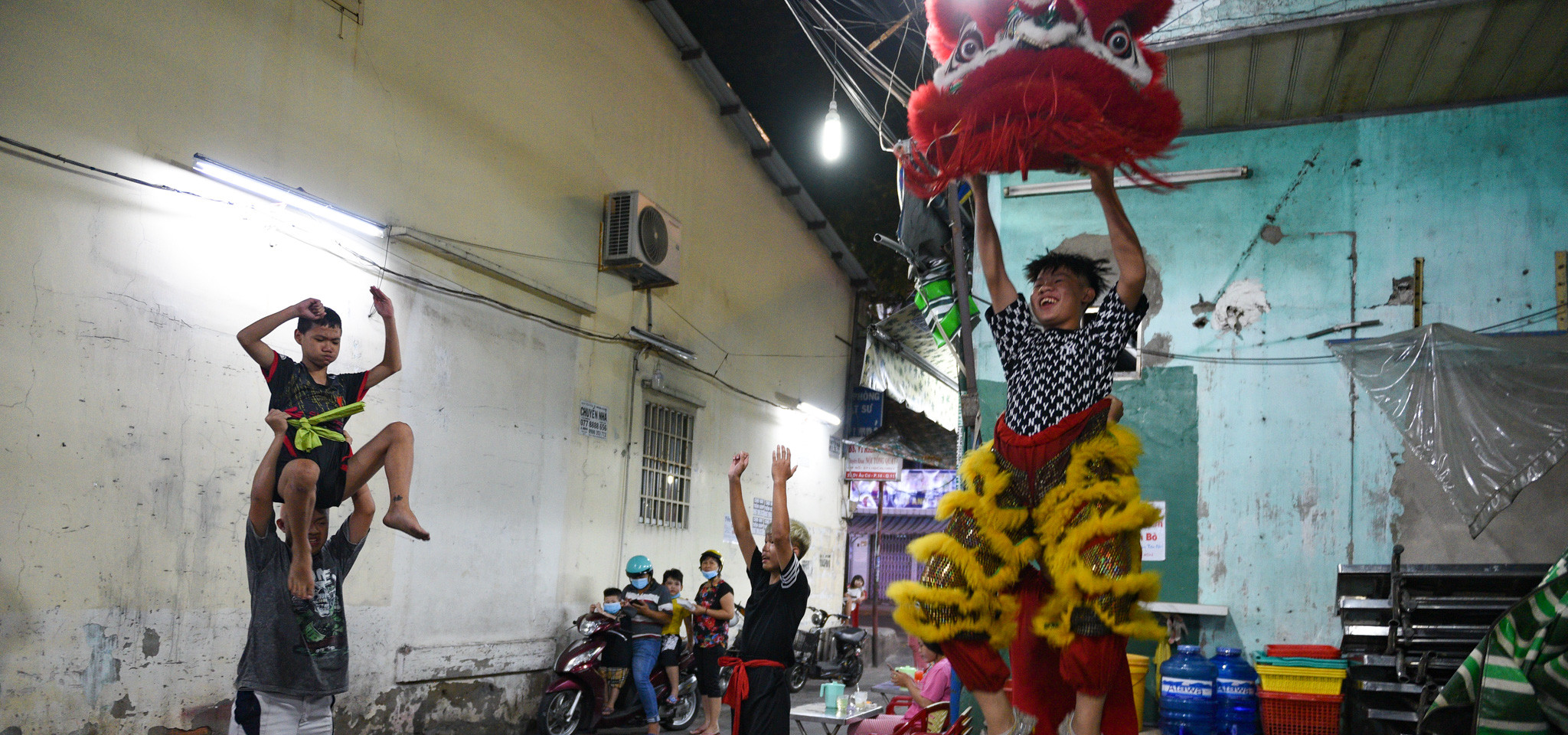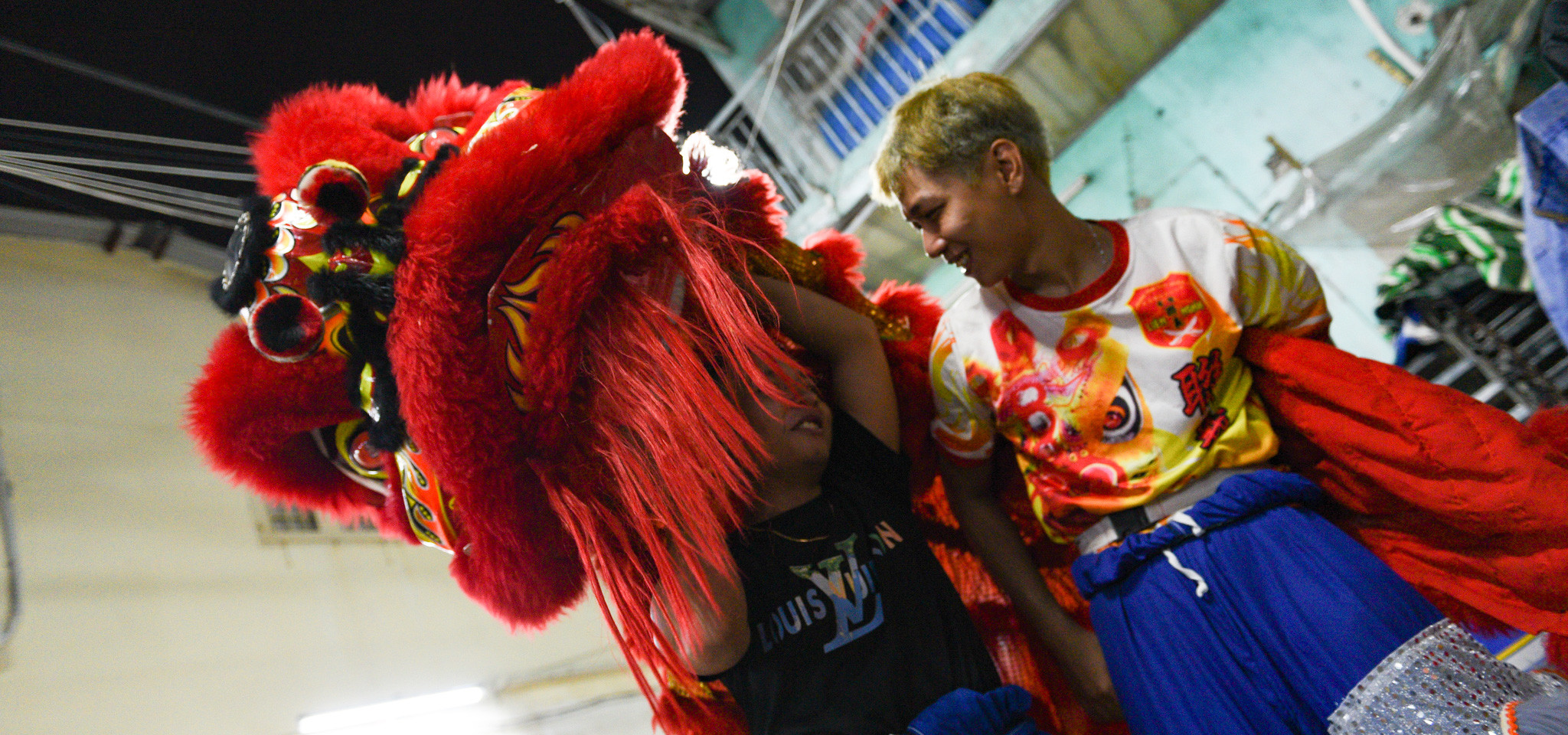“Hồi bé em được bố mẹ cho đi xem múa lân xong thích quá, lớn em xin tham gia vào đoàn luôn”, Phạm Minh Duy, (bên phải, 15 tuổi, đã tham gia đoàn lân sư rồng được 3 năm) nói.