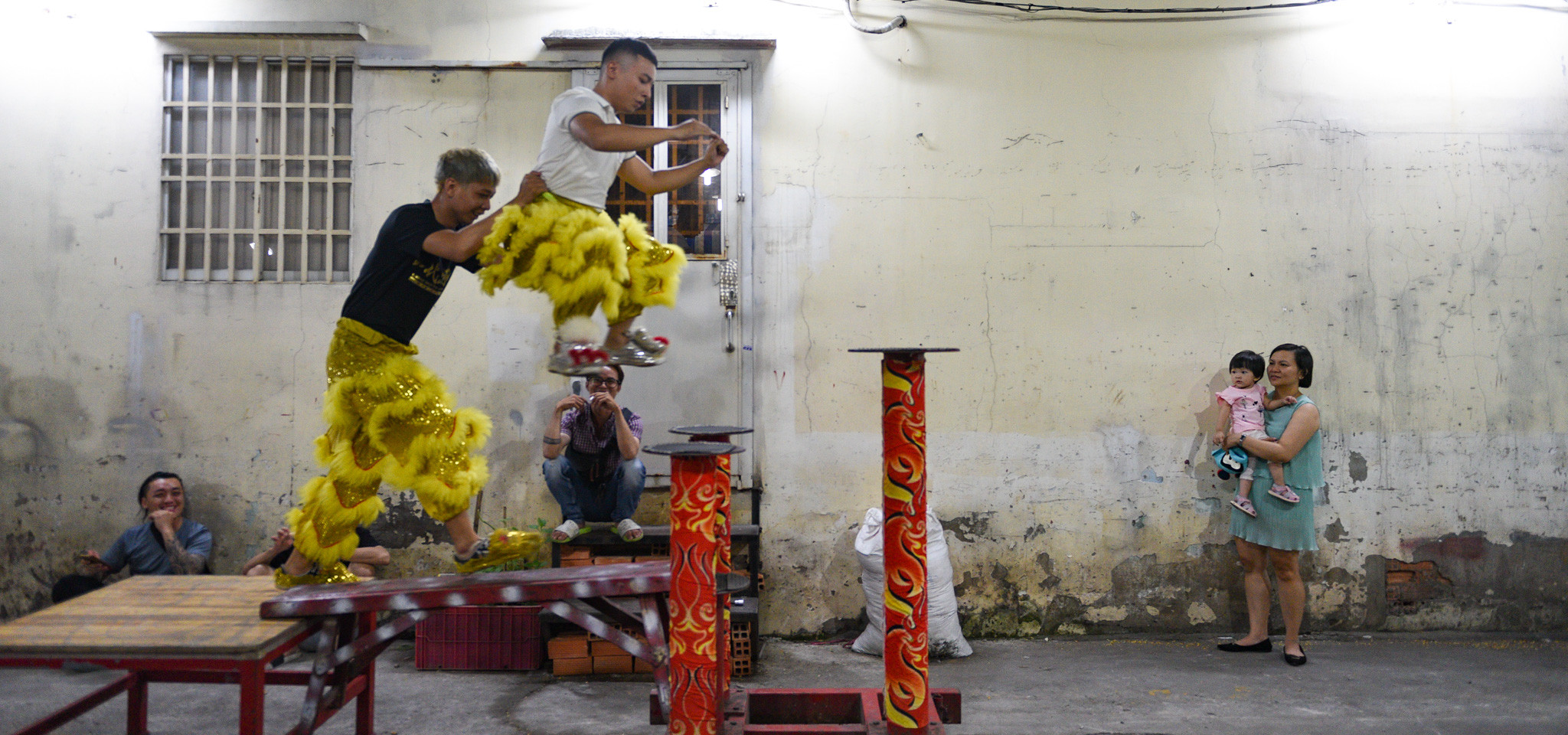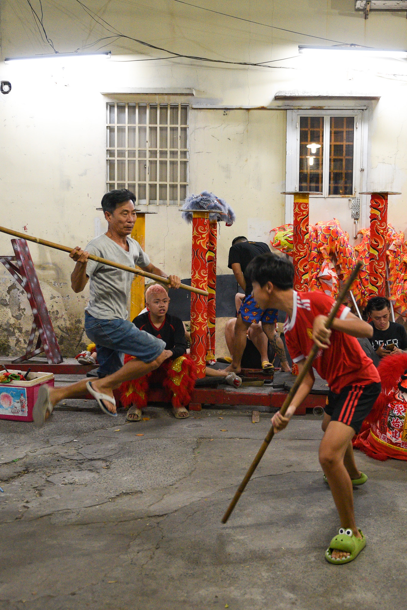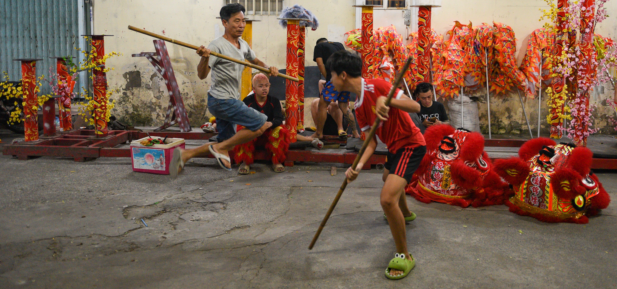 Trong một buổi tập, các thành viên đang luyện động tác múa lân, rồng, nhảy mai hoa thung. Khi tiếng trống rộn ràng khắp hẻm nhỏ cũng là lúc người dân cũng đổ ra xem.