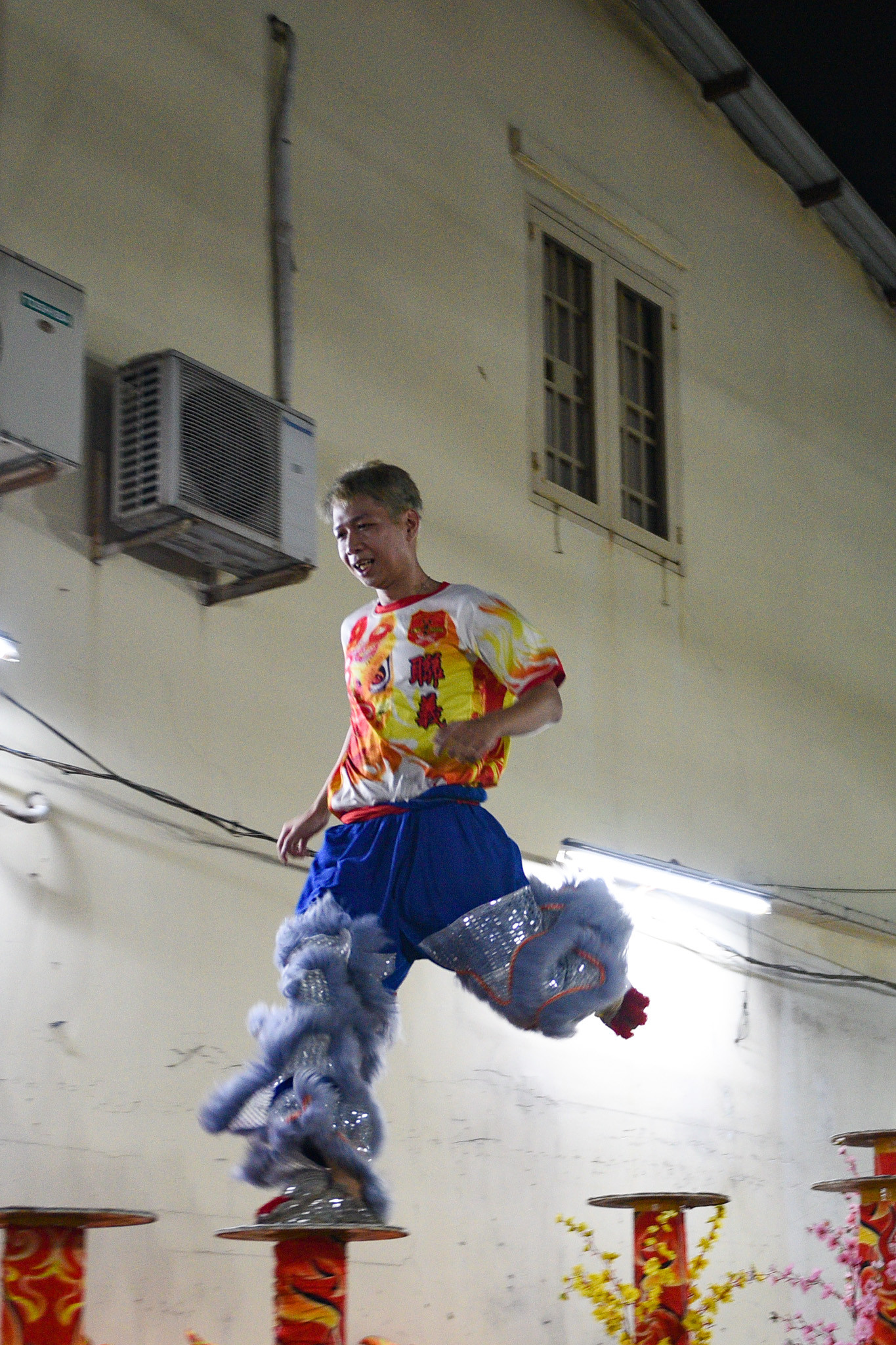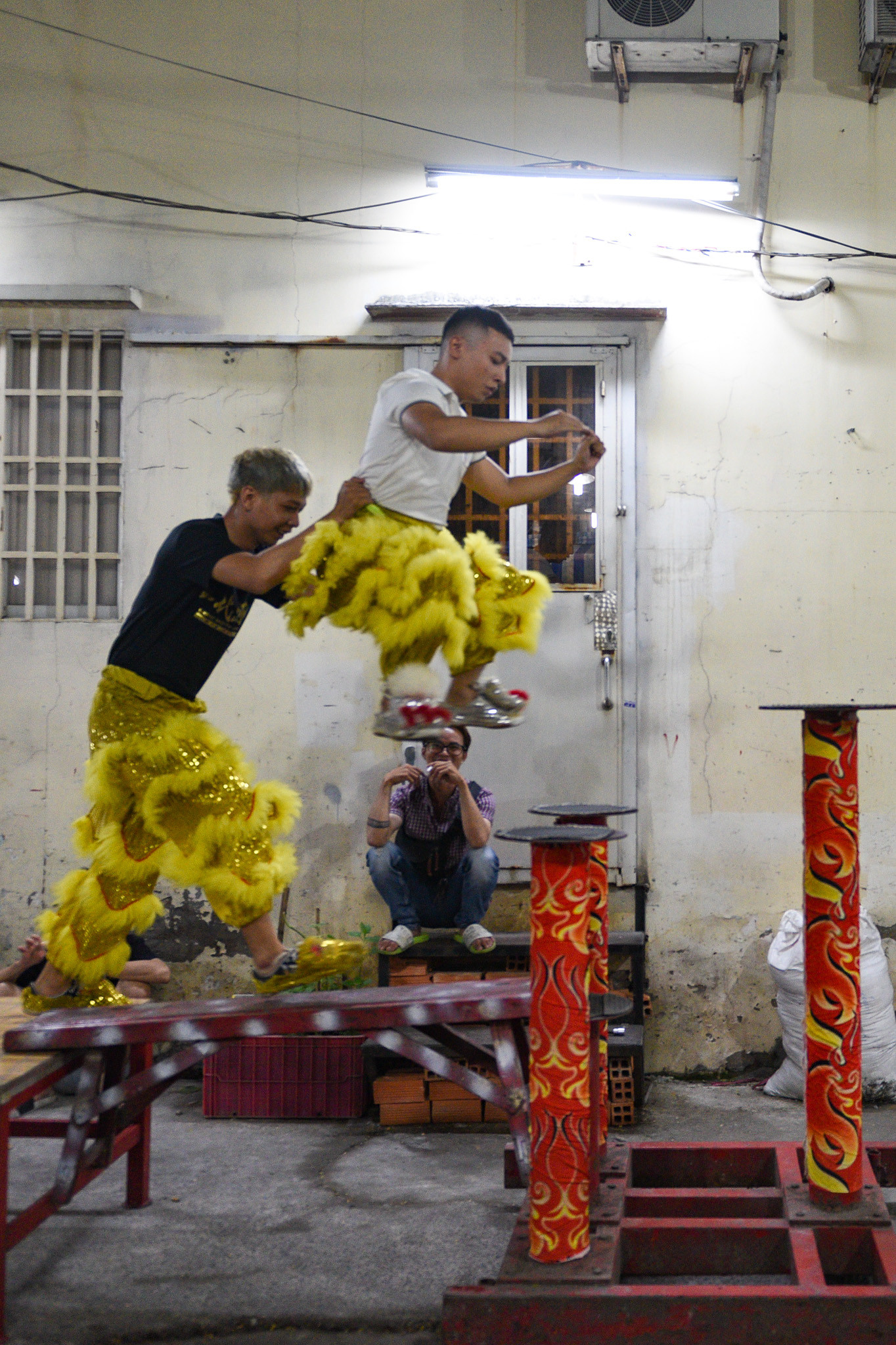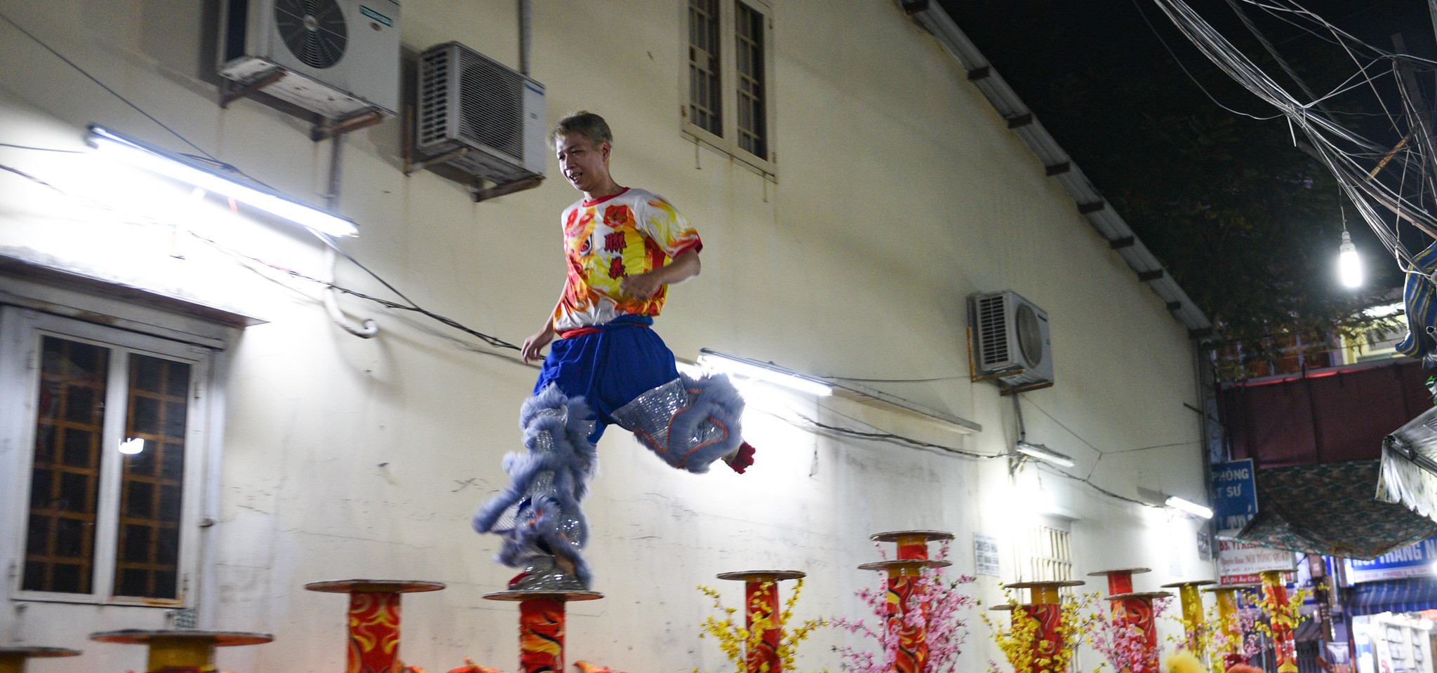 Một thành viên nhảy trên các cột cao để tập luyện cho bài mai hoa thung. “Đây cũng là phần biểu diễn khó nhất của bộ môn này. Nếu không cẩn thận họ rất dễ gặp phải chấn thương”, thành viên Ngô Vĩ Toàn chia sẻ.