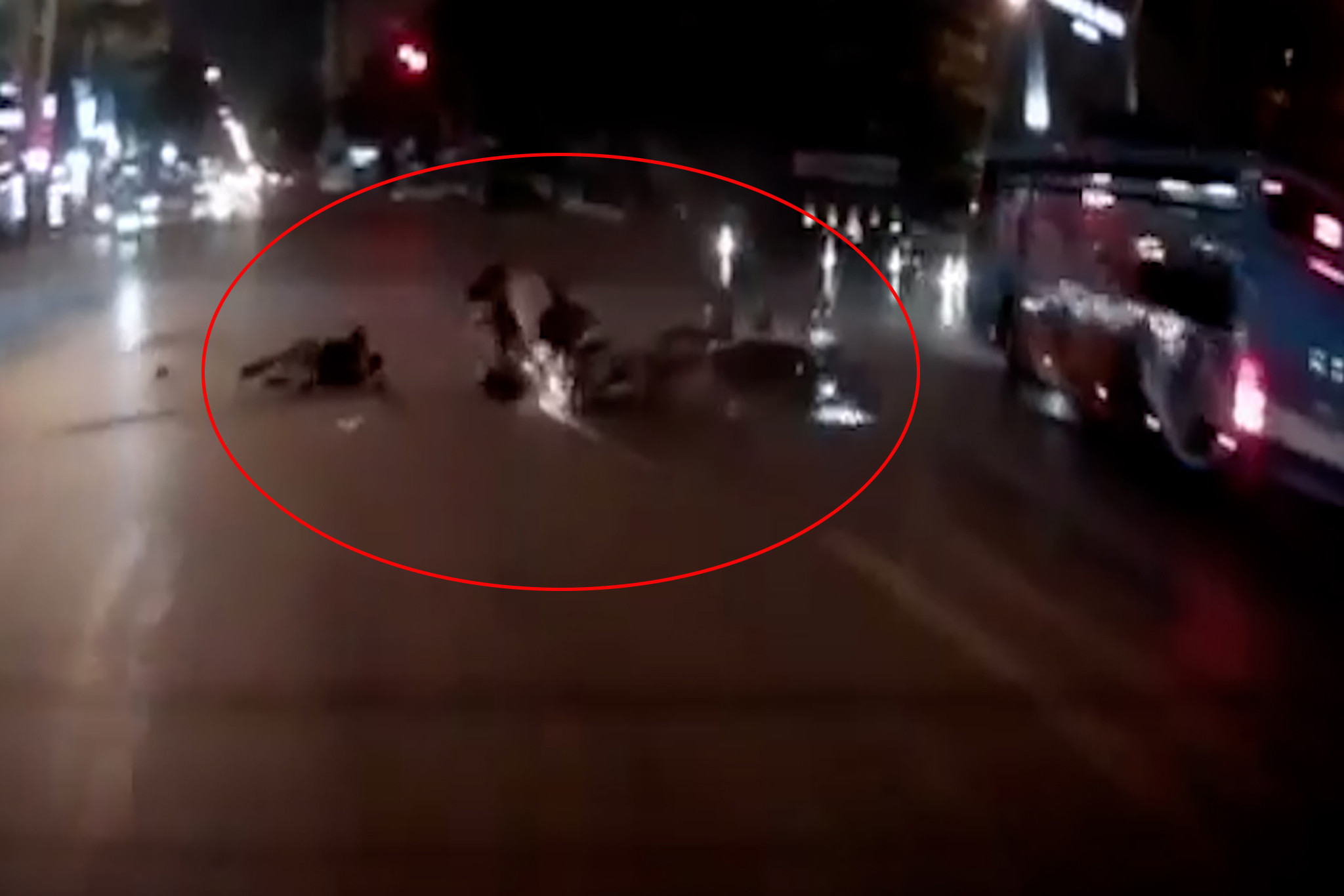 Tối 23/4, clip ghi lại cảnh đoàn xe máy đi với tốc độ cao qua ngã ba Trần Nhân Tông – Lê Duẩn (Nguyễn Du, Hai Bà Trưng, Hà Nội) thì bất ngờ va chạm với xe máy vượt đèn đỏ được chia sẻ trên mạng xã hội. Sau cú va chạm mạnh, 5 thanh niên đi trên 3 xe máy bị ngã ra đường.