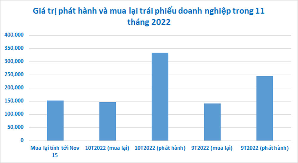 Niềm tin trên thị trường trái phiếu sụt giảm, qua đó hoạt động huy động mới giảm mạnh trong khi áp lực đối với nhiều doanh nghiệp phát hành là rất lớn. Hoạt động mua lại trước hạn tăng vọt, với tổng giá trị lên tới hơn 152.000 tỷ đồng trong hơn 11 tháng năm 2022, tăng gần 50% so với cùng kỳ.