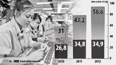 Trong khi doanh nghiệp trong nước co cụm, chật vật bươn chải để tồn tại thì các doanh nghiệp có vốn đầu tư nước ngoài lại tăng tốc mở rộng sản xuất, nhất là trong lĩnh vực xuất khẩu chủ lực của Việt Nam.