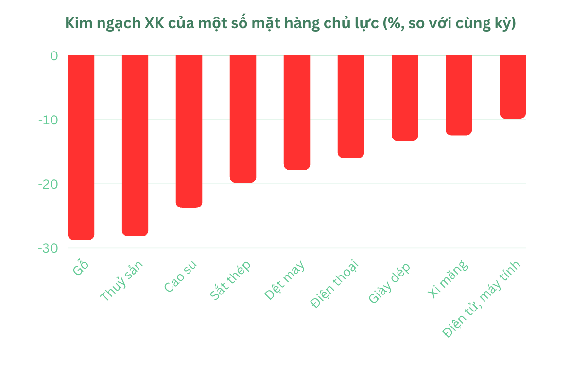 Điển hình, kim ngạch xuất khẩu ngành gỗ giảm đến 28,7% so với cùng kỳ năm trước, thuỷ sản giảm đến 28,1%. Trong các thị trường xuất khẩu chính của Việt Nam, Hàn Quốc là thị trường đang sụt giảm nghiêm trọng nhất so với cùng kỳ, từ -7,1% xuống còn -26,8%, tiếp sau là thị trường Hoa Kỳ với mức giảm -19,5% và ASEAN là -15,2%.