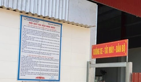 Công ty đặt bảng nội quy ra vào, với dòng chữ "Xuống xe, tắt máy, dẫn bộ" ngay ở đầu đường.