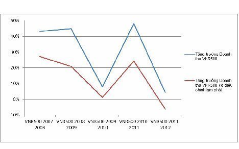 Doanh thu các doanh nghiệp VNR500 tăng trưởng không đều qua các năm và tỷ lệ thuận với tỷ lệ lạm phát của năm tính doanh thu xếp hạng. Điều này chứng tỏ sự tăng trưởng nóng và ngắn hạn của nền kinh tế. Đặc biệt đáng chú ý là trong BXH 2012, mặc dù tỷ lệ lạm phát là cao nhưng tăng trưởng doanh thu của các doanh nghiệp VNR500 không tăng tương ứng mà sụt giảm rất thấp. Tăng trưởng tổng doanh thu của 500 doanh nghiệp VNR500 2012 điều chỉnh theo lạm phát năm giảm 6,29% so với năm trước đó.