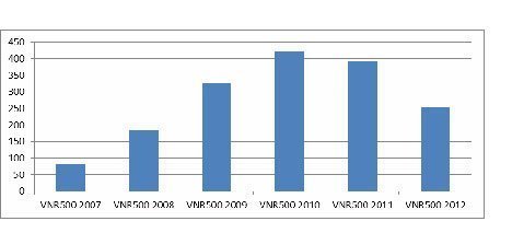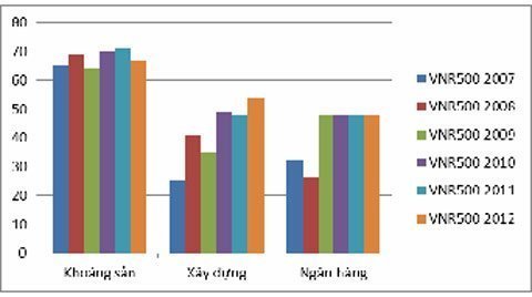 Tuy nhiên, trong bối cảnh kinh tế khó khăn, chỉ các doanh nghiệp ngân hàng, chứng khoán, bảo hiểm có tăng trưởng về doanh thu so với năm trước đó, đạt hơn 28%. Các doanh nghiệp khai thác khoáng sản và dầu khí xuất hiện trong bảng xếp hạng VNR500 2012 có tổng doanh thu giảm hơn 4% so với năm 2011, còn các doanh nghiệp xây dựng bất động sản có tổng doanh thu giảm tới hơn 10%.