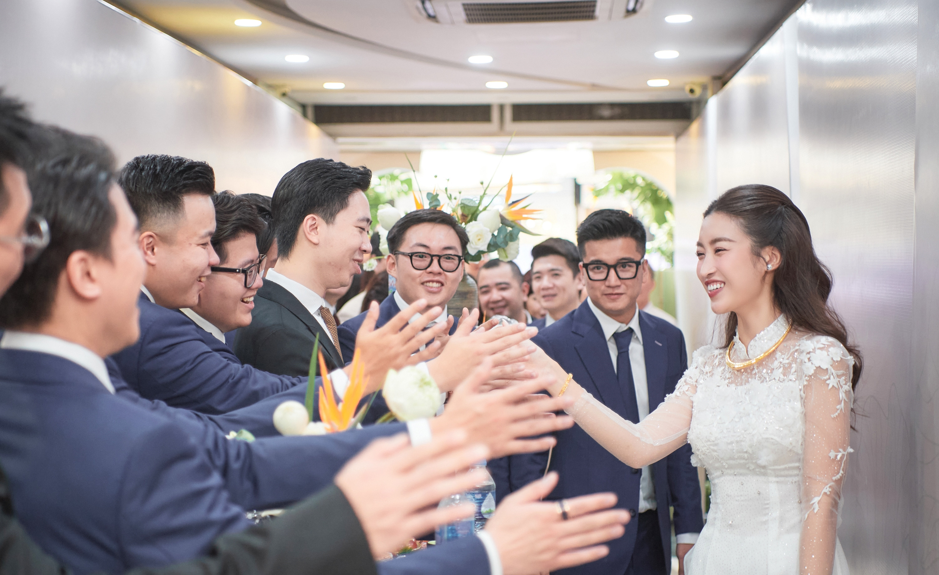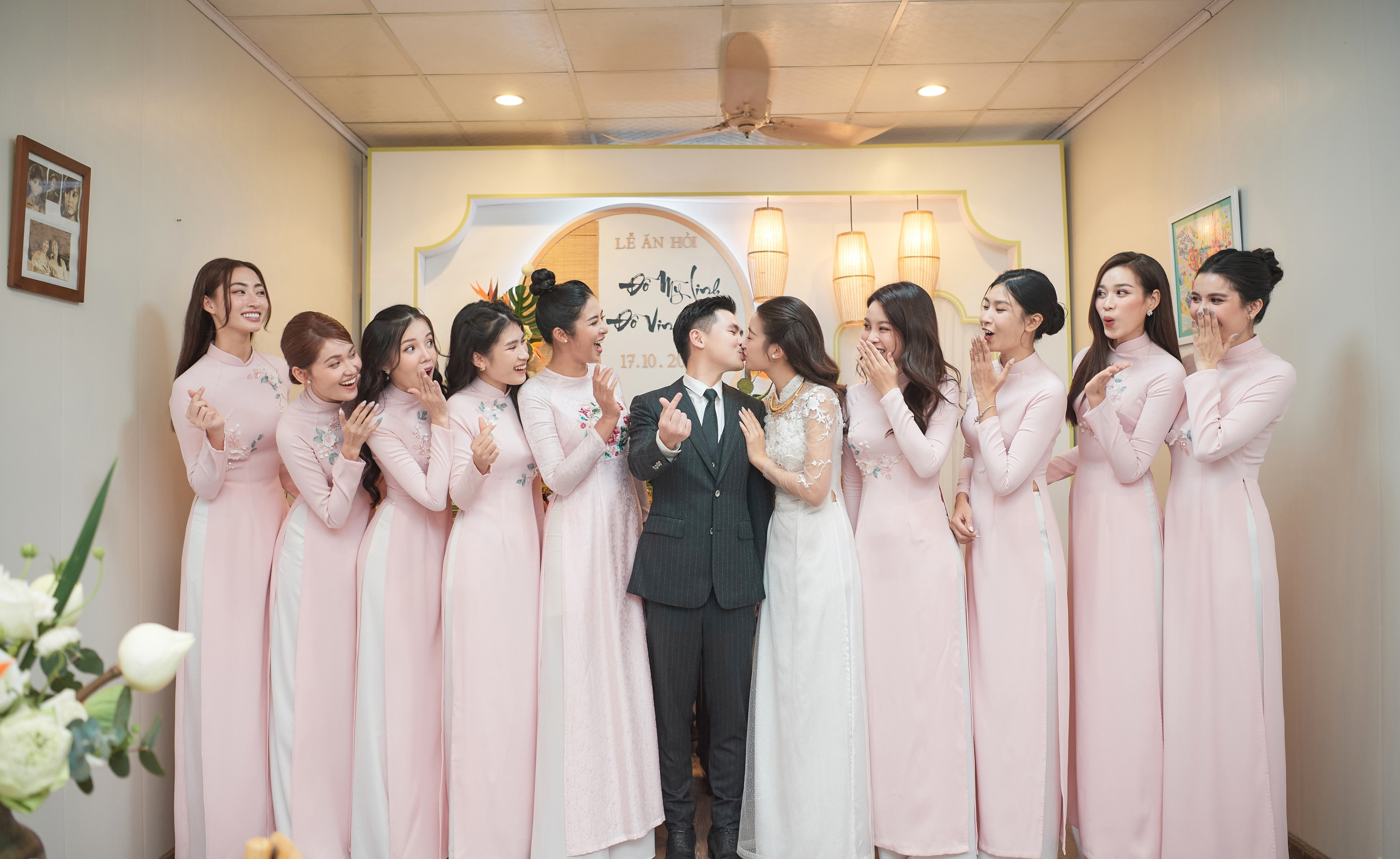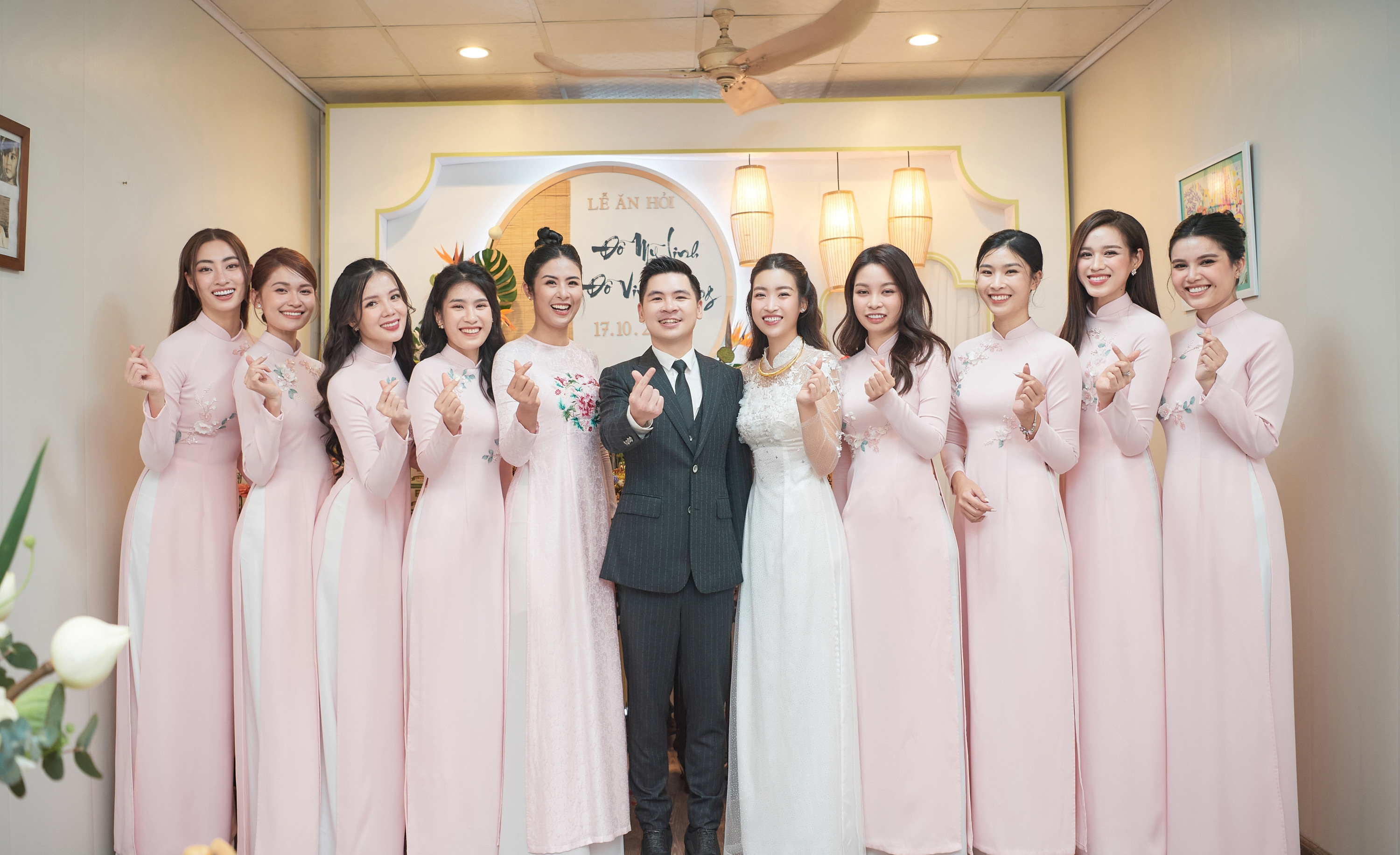 Chiều 17/10, đám hỏi Hoa hậu Đỗ Mỹ Linh và doanh nhân trẻ Đỗ Vinh Quang diễn ra tại nhà riêng của cô dâu tại Hà Nội. Ngày đặc biệt diễn ra chỉ sau khi cô dâu Đỗ Mỹ Linh công bố chồng sắp cưới vài ngày trước đó - đúng sinh nhật 26 tuổi của cô.Buổi lễ ăn hỏi của Hoa hậu Đỗ Mỹ Linh và con trai bầu Hiển diễn ra ấm cúng, trước sự chứng kiến của người thân và những bạn bè thân thiết của cặp đôi.Từ trước đến nay, Đỗ Mỹ Linh luôn kín tiếng về chuyện tình cảm. Chỉ sát ngày tổ chức lễ ăn hỏi và hôn lễ, hoa hậu mới công khai chuyện tình cảm. Trong buổi lễ hôm nay, cô không ngần ngại trao chồng nụ hôn ngọt ngào.Chú rể Vinh Quang và cô dâu Mỹ Linh vui vẻ chụp ảnh cùng dàn phù dâu vừa xinh đẹp, vừa nổi tiếng.Cô dâu Đỗ Mỹ Linh không giấu được niềm vui trong ngày trọng đại của cuộc đời. Dường như cô cũng đã quá thân quen với những người bạn của chú rể.Đỗ Mỹ Linh mặc áo dài trắng nổi bật giữa dàn phù dâu, phù rể. Chú rể Vinh Quang cũng không giấu được niềm hạnh phúc trong ngày trọng đại. Vinh Quang được đánh giá là một doanh nhân trẻ lịch lãm và phong độ. Cặp đôi được nhận xét là trai tài, gái sắc, nhận được nhiều lời chúc mừng của mọi người.