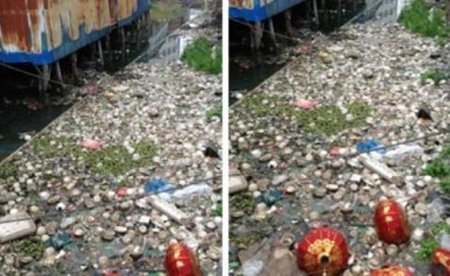 Trong ba bức ảnh mà ông Jin đăng lên mạng, có thể nhìn thấy một dòng sông tại thị trấn nhỏ Ruian ngập kín rác. Ông Jin đổ lỗi cho một công ty sản xuất ủng cao su đã xả rác thải công nghiệp ra sông."