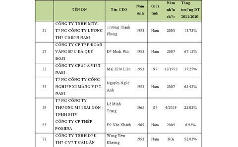 ĐIỂM MẶT CÁC CEO TUỔI TỴ THUỘC TOP 100 CỦA BẢNG XẾP HẠNG VNR500 NĂM 2012