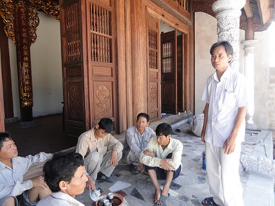 | Anh Bảy (đứng) chỉ đạo thợ hoàn thiện ngôi đền thờ Bác Hồ. |