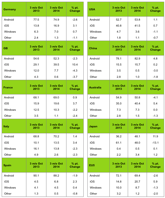 Bảng dưới đây thể hiện thị phần của Android, iOS, Windows và các dòng khác tại các quốc gia như Đức, Mỹ, Anh, Trung Quốc, Pháp, Úc, Ý, Nhật Bản, Tây Ban Nha và 5 nước EU trong vòng ba tháng 8,9 và 10 các năm 2013 và 2014. Bạn có thể rút ra sự so sánh một cách dễ dàng khi nhìn vào các số liệu này. Dường như việc tăng kích thước màn hình điện thoại đã giúp Apple tăng doanh số lên đáng kể.
