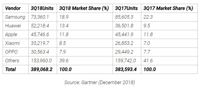 Báo cáo chỉ ra rằng nếu không có Huawei và Xiaomi, doanh số smartphone sẽ giảm 5,2% trên toàn cầu. Giám đốc nghiên cứu Gartner Anshual Gupta viết: “Nhờ có phân khúc điện thoại thông minh giá rẻ nhưng các tính năng camera nâng cao và màn hình độ phân giải chất lượng cao, các nhà sản xuất điện thoại di động hàng đầu Trung Quốc đã tăng doanh số bán hàng trên các thị trường mới nổi trong quý 3 năm 2018”.