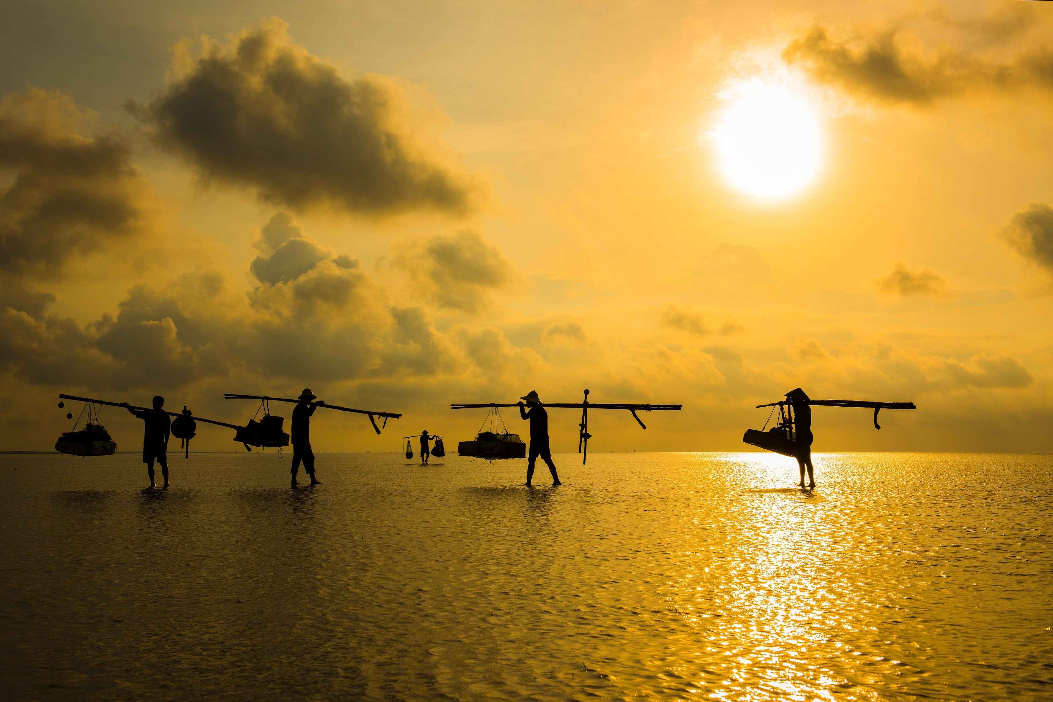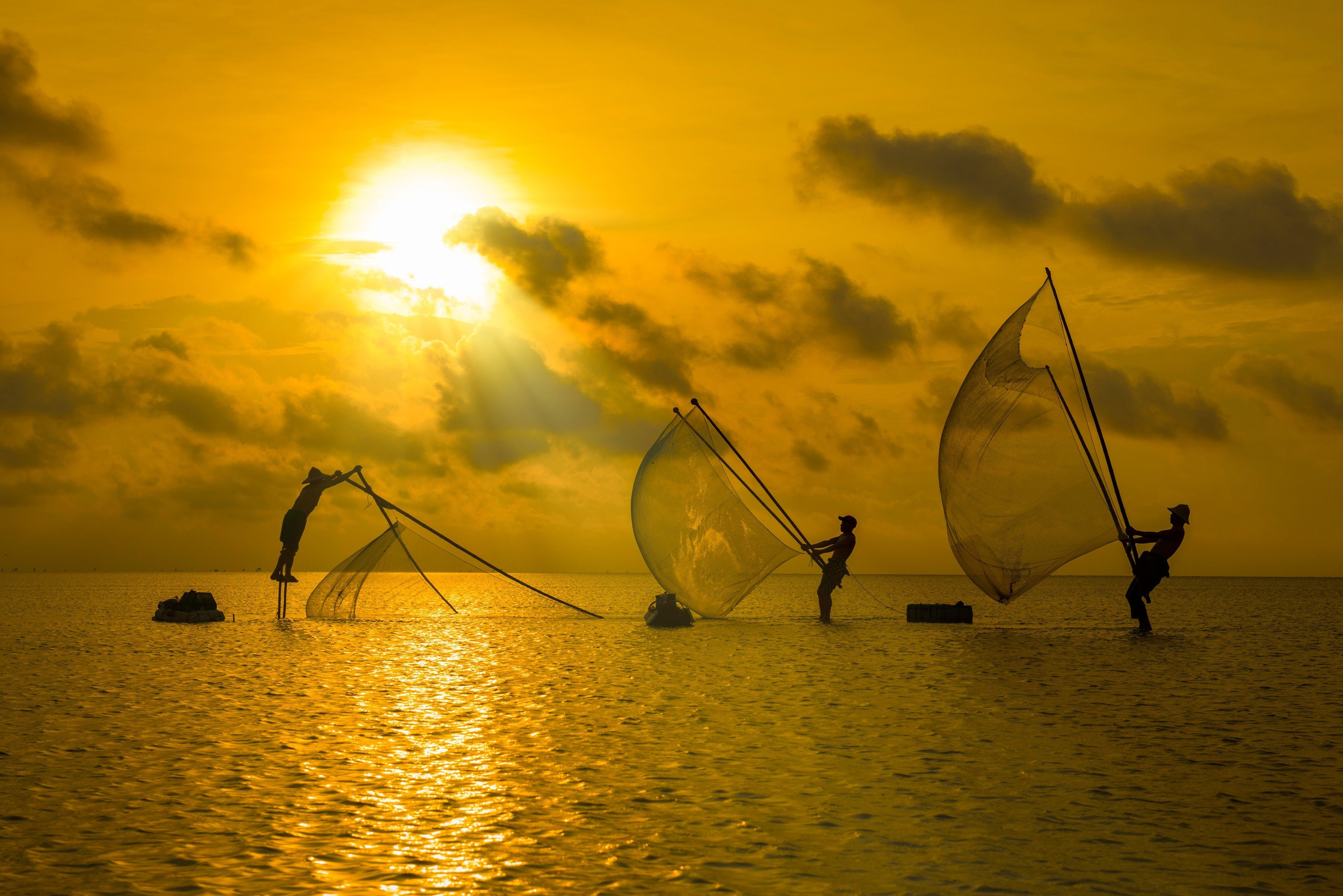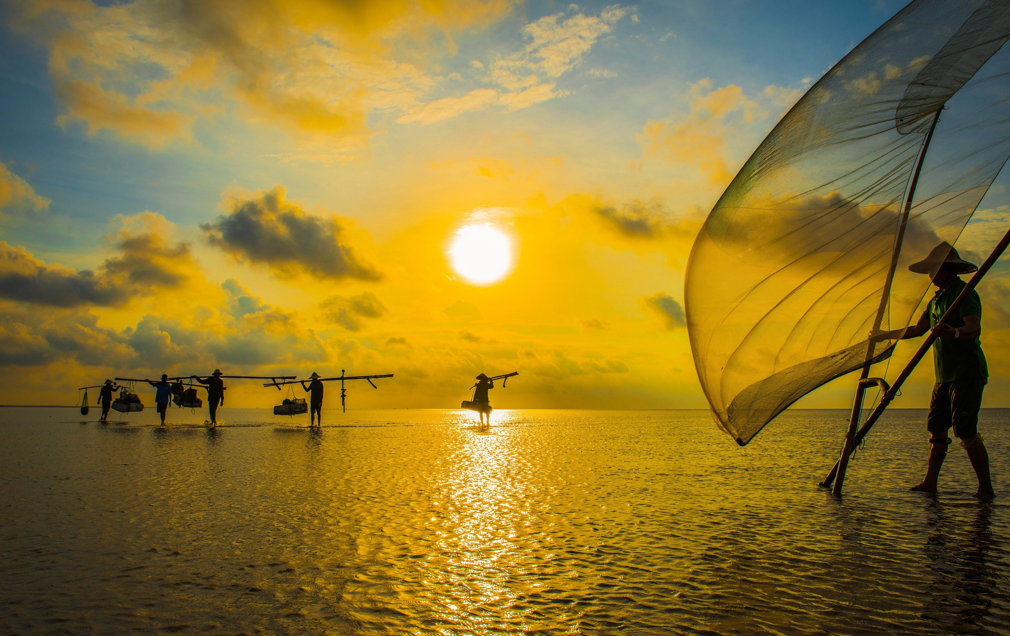 Những ngư dân đang kéo te, đánh bắt cá trong ánh bình minh qua ống kính của nhiếp ảnh gia Khang Chu Long đầy tính nghệ thuật.