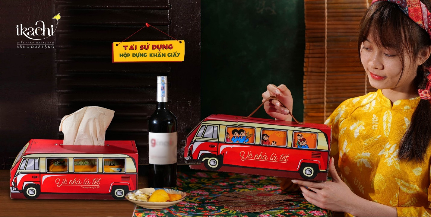 Nổi bật là hộp quà “Chuyến xe hạnh phúc” và “Đón xe về Tết” được lấy ý tưởng từ câu chuyện của những người con xa quê luôn trông mong, háo hức đến ngày nghỉ để bắt kịp chuyến xe về quê ăn Tết bên gia đình. Tạo hình chiếc xe là điểm nhấn đặc biệt ở sản phẩm.