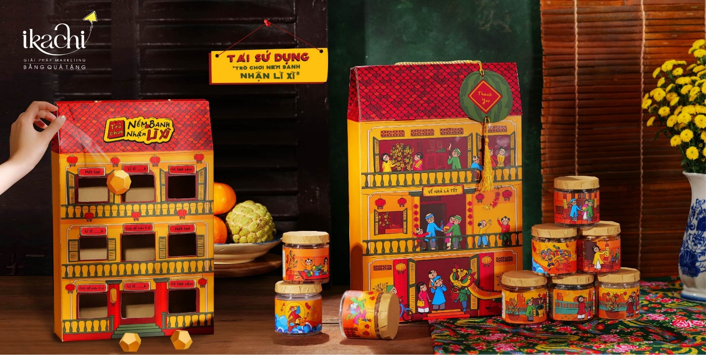 Hay trong hộp quà “Nhà Tết cổ truyền” tái hiện đặc sắc những hoạt động vui chơi đón Tết trong khung cảnh hối hả, rực rỡ sắc màu của ngày đầu xuân như: đón giao thừa, chúc tết ông bà, đi chùa đầu năm, nấu bánh chưng… Ikachi mang đến những hình ảnh rực rỡ, đậm màu sắc truyền thống.