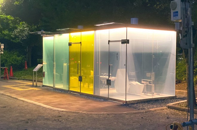 Các nhà vệ sinh với đủ màu sắc này nằm trong công viên Shibuya, Tokyo. Được biết, nhà vệ sinh sử dụng công nghệ kính thông minh. Khi có dòng điện chạy qua các phân tử tinh thể lỏng trong các tấm kính, lúc này các phân tử sẽ xếp thẳng hàng và cho phép ánh sáng đi xuyên qua khiến lớp kính trở nên trong suốt.