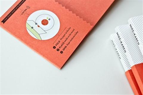 Đính kèm trong tấm thiệp mời là một chiếc đĩa từ và một kim đọc. Khi gấp lớp vở ngoài, tấm thiệp mời đám cưới sẽ trở thành một máy chơi đĩa quay tay. Sử dụng tay để quay chiếc đầu độc quanh chiếc đĩa được đính kèm, ca khúc của cô dâu và chú rể sẽ được ngân vang.