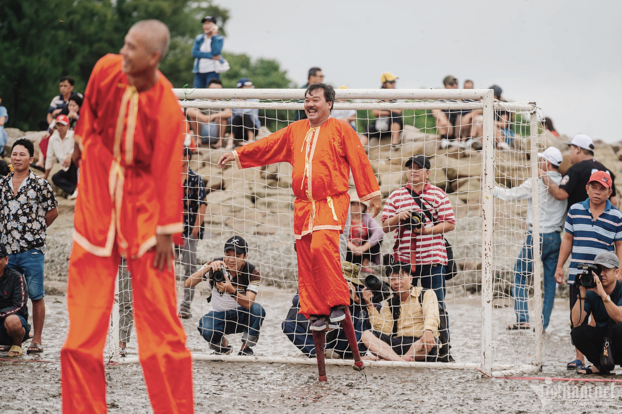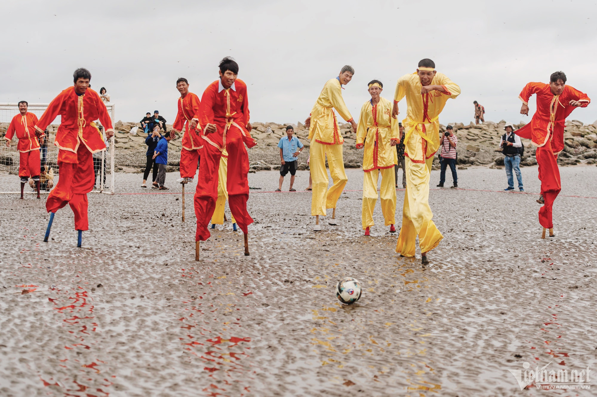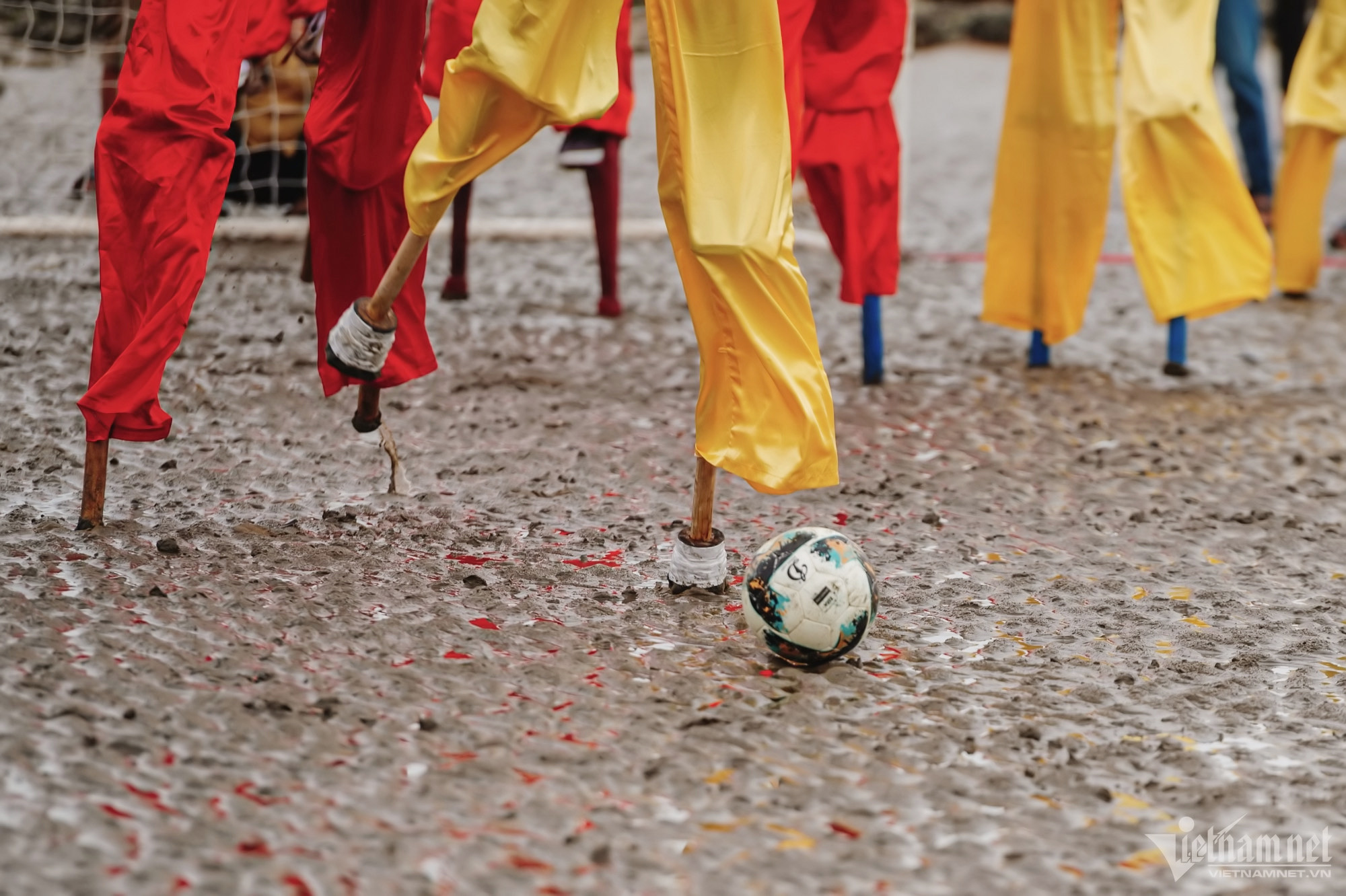 Khác với những trận bóng đá trên sân cỏ, cầu thủ của trận đấu này mang đôi cà kheo với dài 80cm, gắn chặt vào đôi chân khiến việc di chuyển và tranh chấp bóng trên nền cát lún khá khó khăn.
