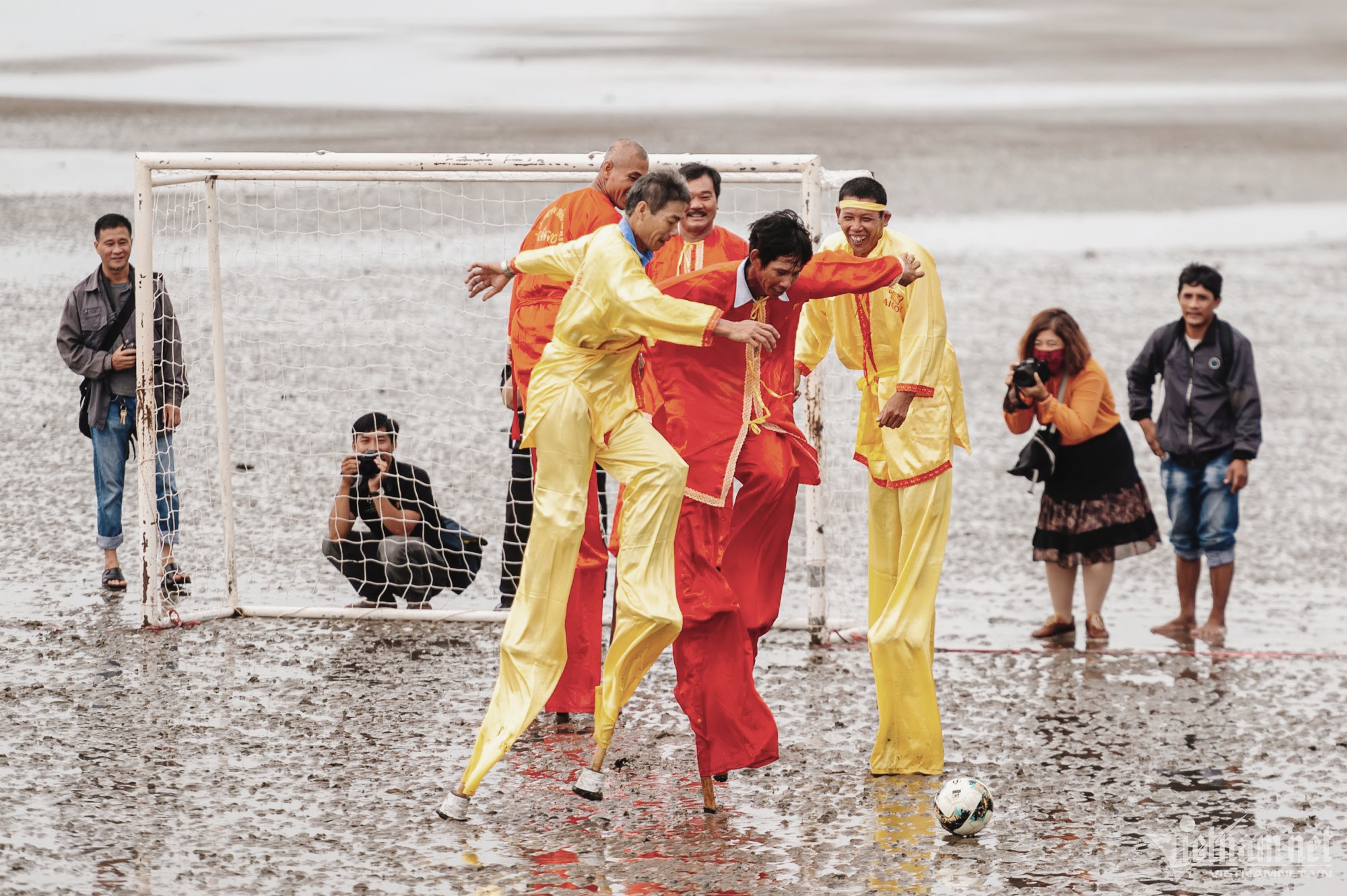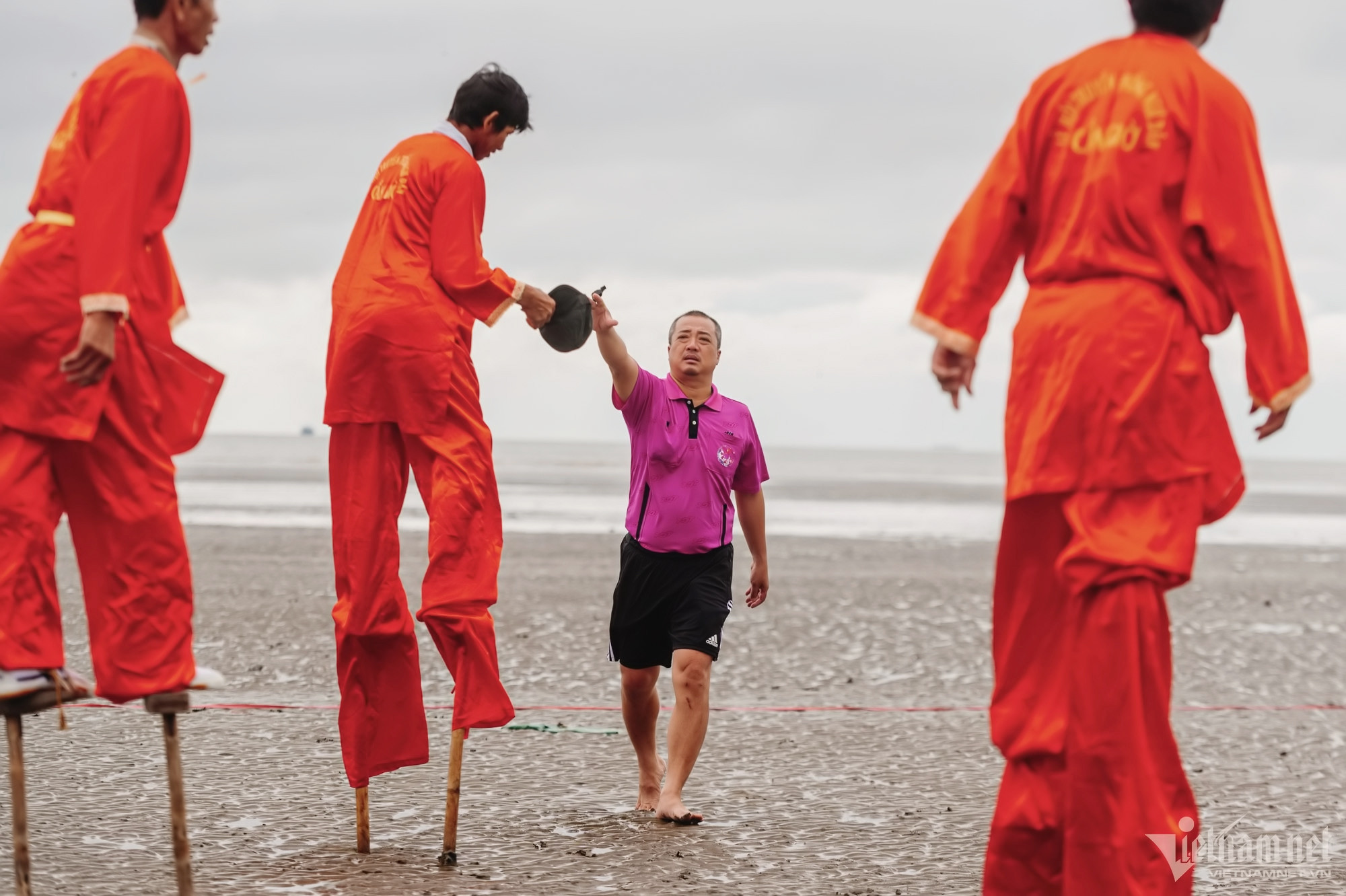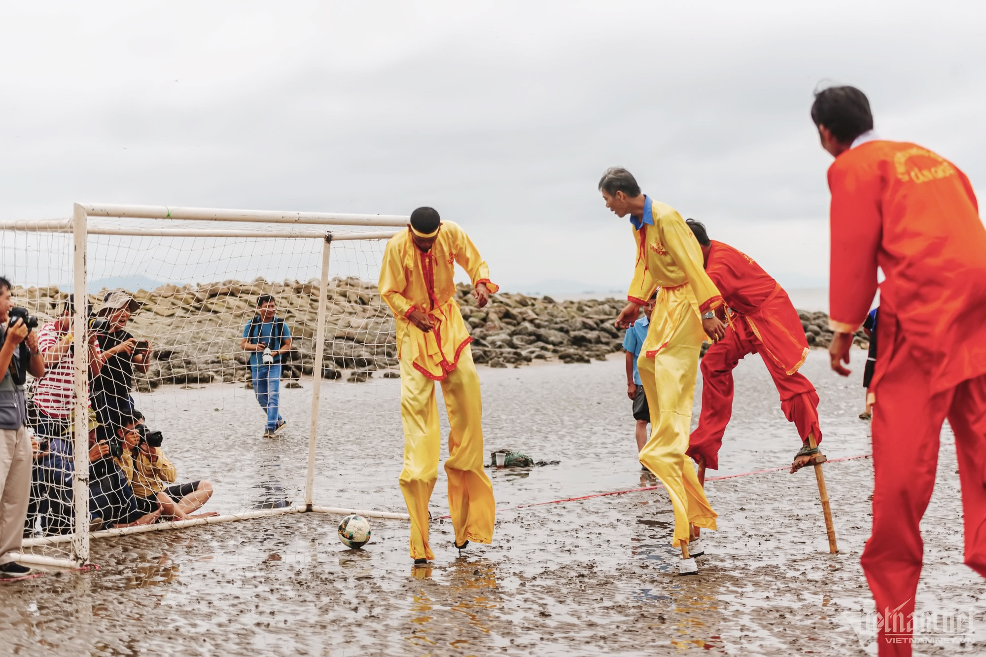 Khác với những trận bóng đá trên sân cỏ, cầu thủ của trận đấu này mang đôi cà kheo với dài 80cm, gắn chặt vào đôi chân khiến việc di chuyển và tranh chấp bóng trên nền cát lún khá khó khăn.