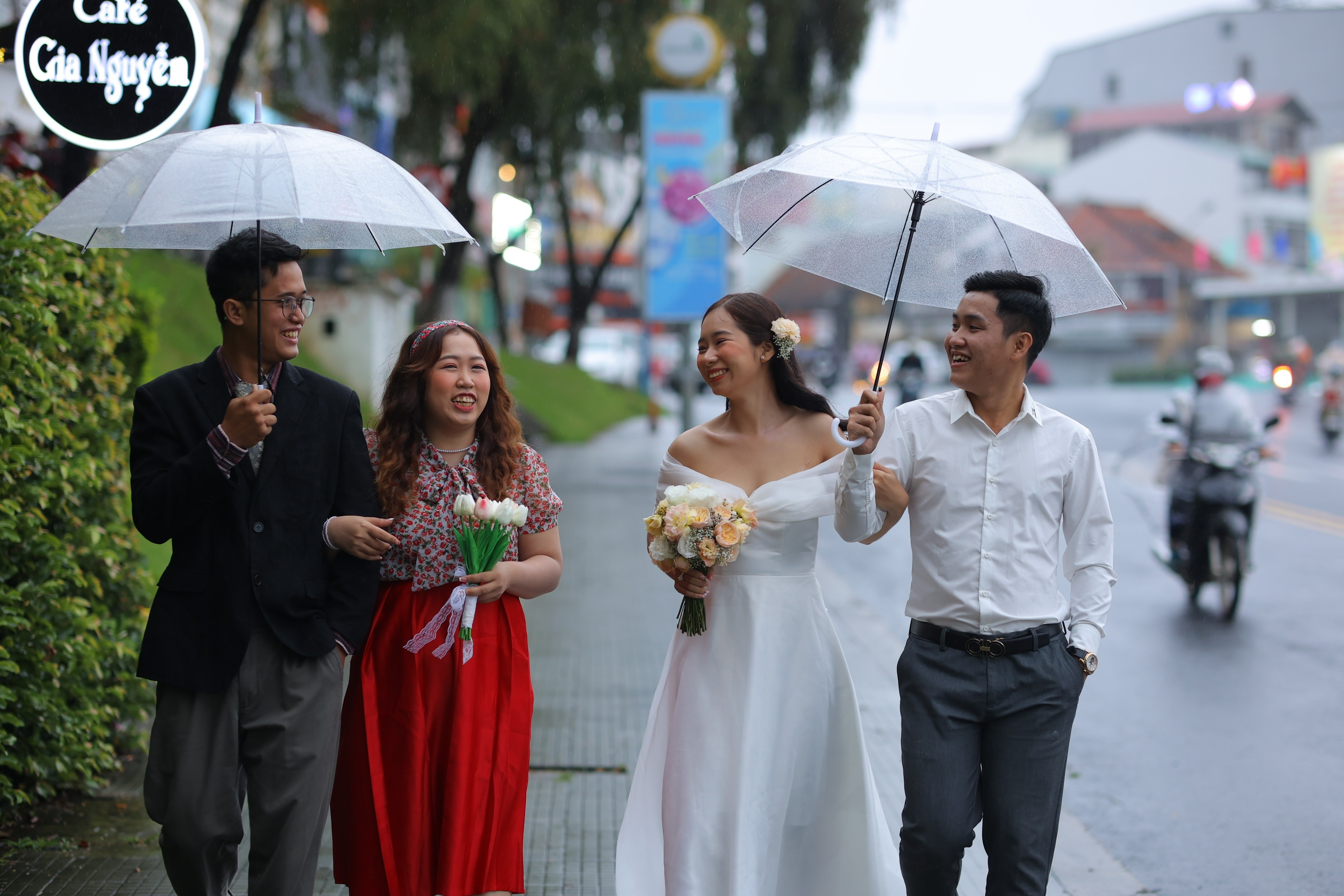 Ngày 26/9, Thanh Tuyền (sinh năm 1999, váy đỏ) cùng bạn trai Trung Kiên, Minh Trang (sinh năm 1999, váy trắng) cùng bạn trai Tiến Minh đến một số địa điểm nổi tiếng ở Đà Lạt để ghi lại những hình ảnh đẹp. Chia sẻ với Zing, Thanh Tuyền cho biết đây là kế hoạch được chuẩn bị trước khoảng 1 tháng, do Minh Trang khởi xướng. "4 đứa di chuyển từ Cần Thơ lên Đà Lạt tối 24/9 và dành ngày hôm sau để thử váy, chọn concept. Mình và Trang đều rất mê khí hậu se lạnh, khung cảnh lãng mạn ở thành phố này nên quyết định chọn đây làm nơi chụp hình cưới", Tuyền kể. Trừ việc săn mây không được như ý, buổi chụp diễn ra khá suôn sẻ và cả nhóm chỉ mất một buổi sáng để hoàn thành."Bọn mình phải dậy từ 1h để trang điểm, làm tóc rồi đi cho kịp. Dù thời tiết khá lạnh, lại phải di chuyển nhiều, ai nấy đều rất hào hứng và vui vẻ. Ê-kíp đi chung cũng rất dễ thương, thường xuyên trêu đùa để bọn mình có những khoảnh khắc cười tự nhiên nhất", Tuyền chia sẻ. Trong khi hai cô dâu là bạn nhiều năm, chú rể Trung Kiên và Tiến Minh mới lần đầu gặp gỡ song cũng nhanh chóng trở nên thân thiết. Ngoài chụp hình cưới, 2 cặp đôi nhân cơ hội ở lại thêm khám phá Đà Lạt.Thanh Tuyền, Minh Trang quen biết từ thời tiểu học. Sống cách nhau chỉ khoảng 3 km, đôi bạn thường xuyên sang nhà nhau chơi, cùng đi học, tham gia các hoạt động ngoại khóa. Dần dần, Trang và Tuyền luôn là người góp mặt trong nhiều cột mốc, kỷ niệm đáng nhớ của đối phương."Càng lớn, mỗi đứa càng bận rộn với cuộc sống riêng song bọn mình luôn cố gắng dành thời gian cho nhau, cùng chia sẻ nhiều điều và bộ ảnh cưới vừa rồi cũng là một trong số đó". Hôn lễ của Tuyền dự kiến diễn ra vào dịp Tết Dương lịch còn Trang sau đó khoảng 1 tháng.Tuyền chia sẻ chuyến đi vừa rồi còn là dịp để cô và người bạn thân kỷ niệm 15 năm chơi chung. "Hai đứa còn đùa sau này sẽ hẹn sinh con cùng thời điểm, tổ chức tiệc kỷ niệm và cùng nhau đi du lịch nhiều nơi nữa vào dịp 20 năm, 30 chơi thân", cô nói.