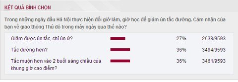 – Theo thông tin từ những phóng viên của VOV Giao thông, thì qua việc theo dõi các phản hồi của bạn nghe đài từ khắp thành phố đã cho thấy một thực tế: Việc đổi giờ học giờ làm đã gây tình trạng tắc nghẽn nhiều hơn là thông thoáng. Khảo sát gần 10.000 bạn đọc của báo VietNamNet cũng cho thấy chiếm đến 2/3 là những ý kiến cho rằng đường sá không thông thoáng hơn là bao.