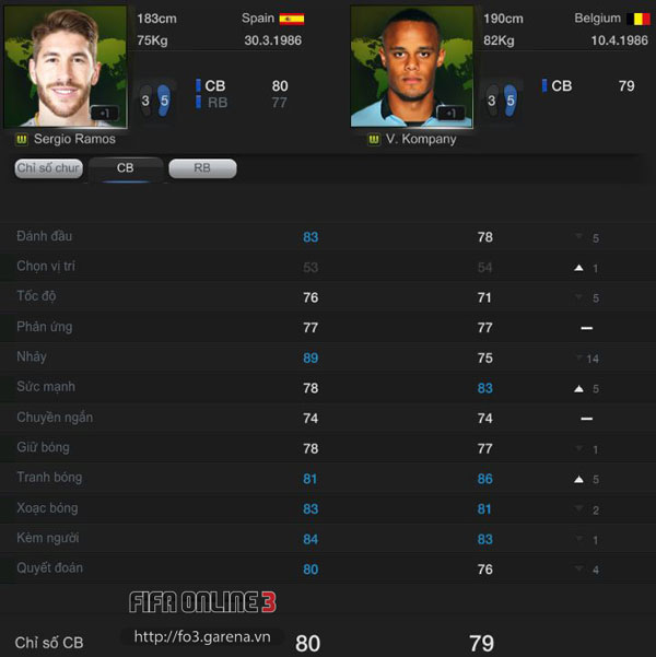 Trong khi Ramos có tốc độ (76) là điểm mạnh, cùng lối chơi lăn xả, quyết đoán, thì Kompany lại sở hữu thể hình lý tưởng cùng sức mạnh đáng nể (83). Cùng nhau, 2 cầu thủ này sẽ tạo nên một cặp trung vệ toàn diện, bổ sung lẫn nhau, và đối phương khó có thể xuyên thủng hàng phòng ngự một khi 2 cầu thủ này chơi đúng phong độ, kể cả khi phải đối mặt với những tiền đạo nguy hiểm nhất.