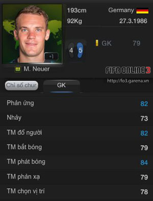 Không thể phủ nhận Neuer là thủ môn số một thế giới hiện tại. Với chiều cao lí tưởng 1m93, cùng các chỉ số thủ môn đều ở mức tốt, Neuer là thủ môn có chỉ số GK cao nhất thẻ World Cup và là cái tên đầu tiên các HLV có thể nghĩ đến khi xây dựng một đội hình với các siêu sao hàng đầu.