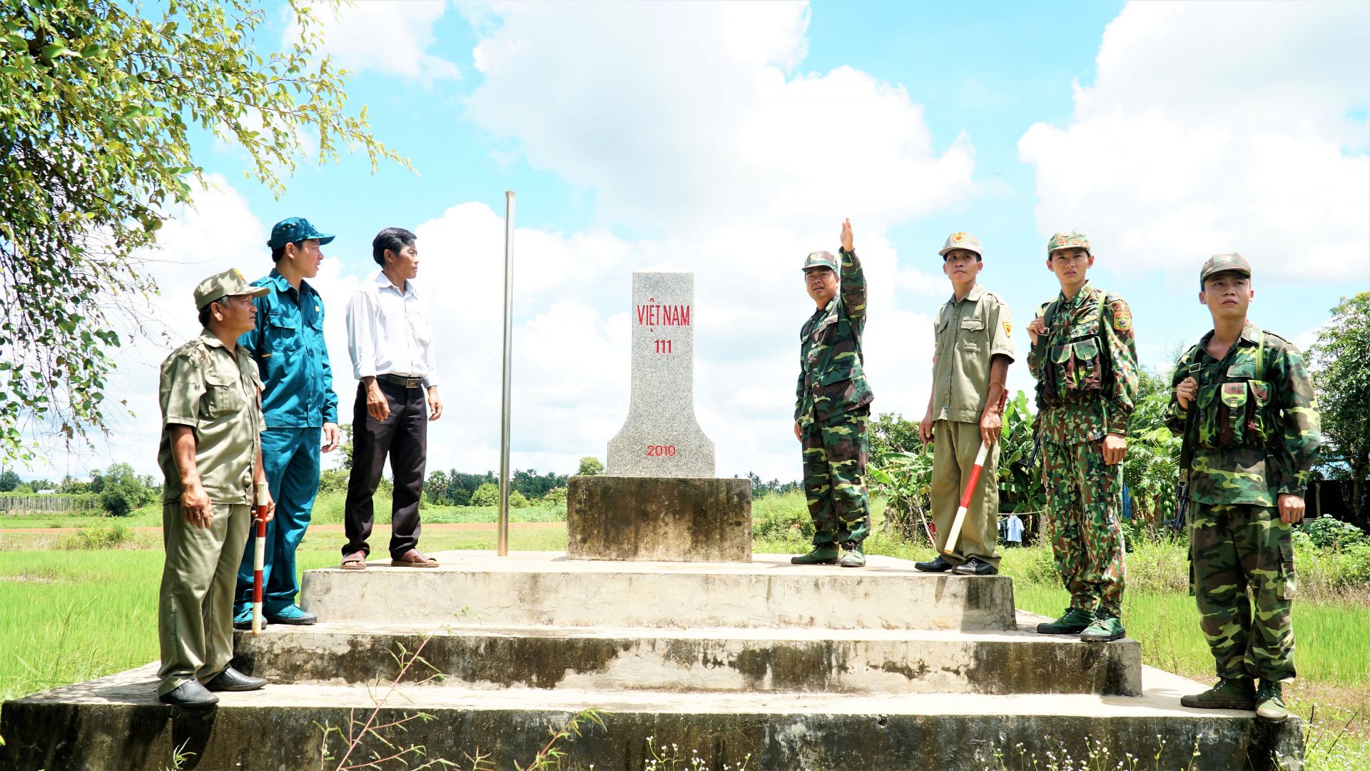 Lực lượng chức năng ấp Tân Khai phối hợp Bộ đội Biên phòng Chàng Riệc giữ gìn cột mốc biên giới, cột mốc 111, thuộc ấp Tân Khai, xã Tân Lập, huyện Tân Biên.