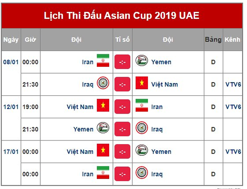 Lịch thi đấu Asian Cup 2019 của đội tuyển Việt Nam: