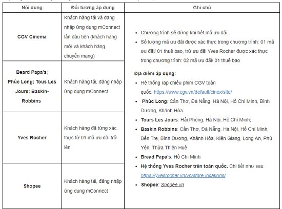 Hãy cùng mConnect trải nghiệm Hè 2019 sôi động với chuỗi chương trình ưu đãi hấp dẫn: Giải trí với 2.000 vé xem phim tại hệ thống các rạp chiếu phim của CGV trên toàn quốc; Hè sảng khoái cùng 1.500 evoucher Got it giảm giá với các thương hiệu Phúc Long luôn mang lại các giá trị đích thực về trà và cà phê cho từng khẩu vị truyền thống của người Việt; Tous Les Jours thương hiệu của chuỗi cửa hàng bánh ngọt tại Hàn Quốc của CJ Foodville; Kem Baskin-Robbins là chuỗi cửa hàng Kem Mỹ lớn nhất Thế giới với hơn 1.300 vị kem hảo hạng; Bánh su kem có xuất xứ từ Nhật Bản Beard Papa’s; Thả ga mua sắm online tại Shopee, kênh mua sắm online hàng đầu tại Việt Nam với hàng triệu sản phẩm thời trang, gia dụng, đồ điện tử… với 1.500 voucher; 2.000 voucher giảm giá Yves Rocher - Vui chơi hè không quên làm đẹp cùng thương hiệu mỹ phẩm chăm sóc da số 1 tại Pháp.