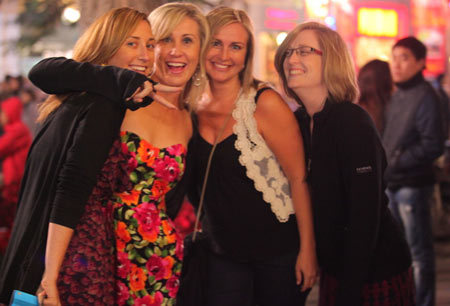 Tại các khu vực trung tâm thành phố, có rất đông người nước ngoài ra đường chào đón năm mới.