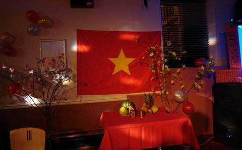 Tết Nguyên Đán được coi là khoảng thời gian đầm ấm nhất trong năm của người dân Việt Nam, khi mà các thành viên tronggia đình cùng sum vầy bên nhau. Dù có sinh sống và làm việc ở đâu, ai cũng luôn cố gắng sắp xếp để về bên gia đình mình vào dịp đặc biệt này. Tuy nhiên, những du học sinh Việt ở nước ngoài lại thường ít khi có đượcmay mắn ấy. Tết Nguyên Đán thường rơi vào tháng 1, tháng 2 dương lịch,trong khi đóđây lại là thời điểm khá căng thẳng vì thi cử đối với hầu hết các du học sinh. Cộng đồng du học sinh Việt Nam tại Newcastle - thành phố phía đông bắc nước Anh, cũng không ngoại lệ.Hôm nay là 30 Tết rồi, cả nước đều đang hân hoan chuẩn bị cho năm mới, bố chắc đang tất bật dọn nhà hoặc đi chúc Tết,mẹ chắc đang bận rộn chuẩn bị cho mâm cỗ cúng giao thừa. Chúng tôi vẫn tiếp tục đến trường, đi làm thêm, nhưng không khỏi bùi ngùi: “Xuân tới con sẽ về!”... Bàn thờ Tổ quốc với hoa đào, hoa mai