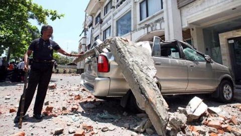 Một chiếc ôtô bị bê tông rơi vào khi xảy ra động đất ở Bali. (Ảnh: AP) |
