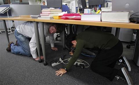 Các phóng viên của Văn phòng AP tại Tokyo trú dưới bàn khi động đất xảy ra. (Ảnh: AP)