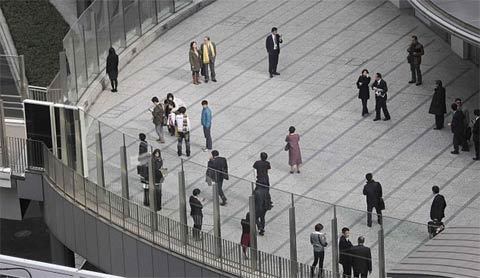 Các nhân viên văn phòng ở quận Shiodome, Tokyo, chạy ra ngoài hành lang sau động đất. (Ảnh: AP)