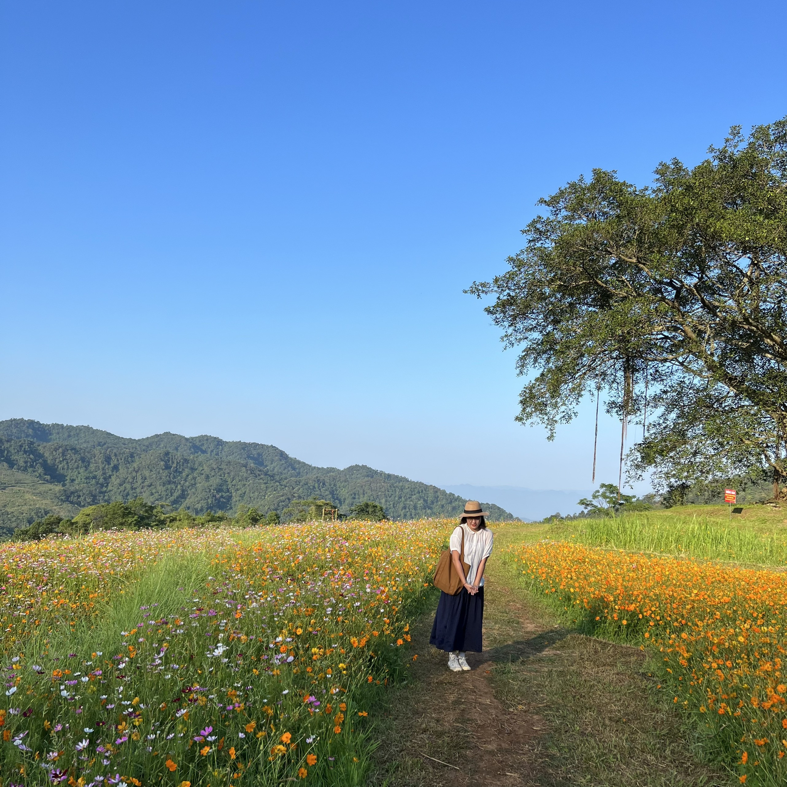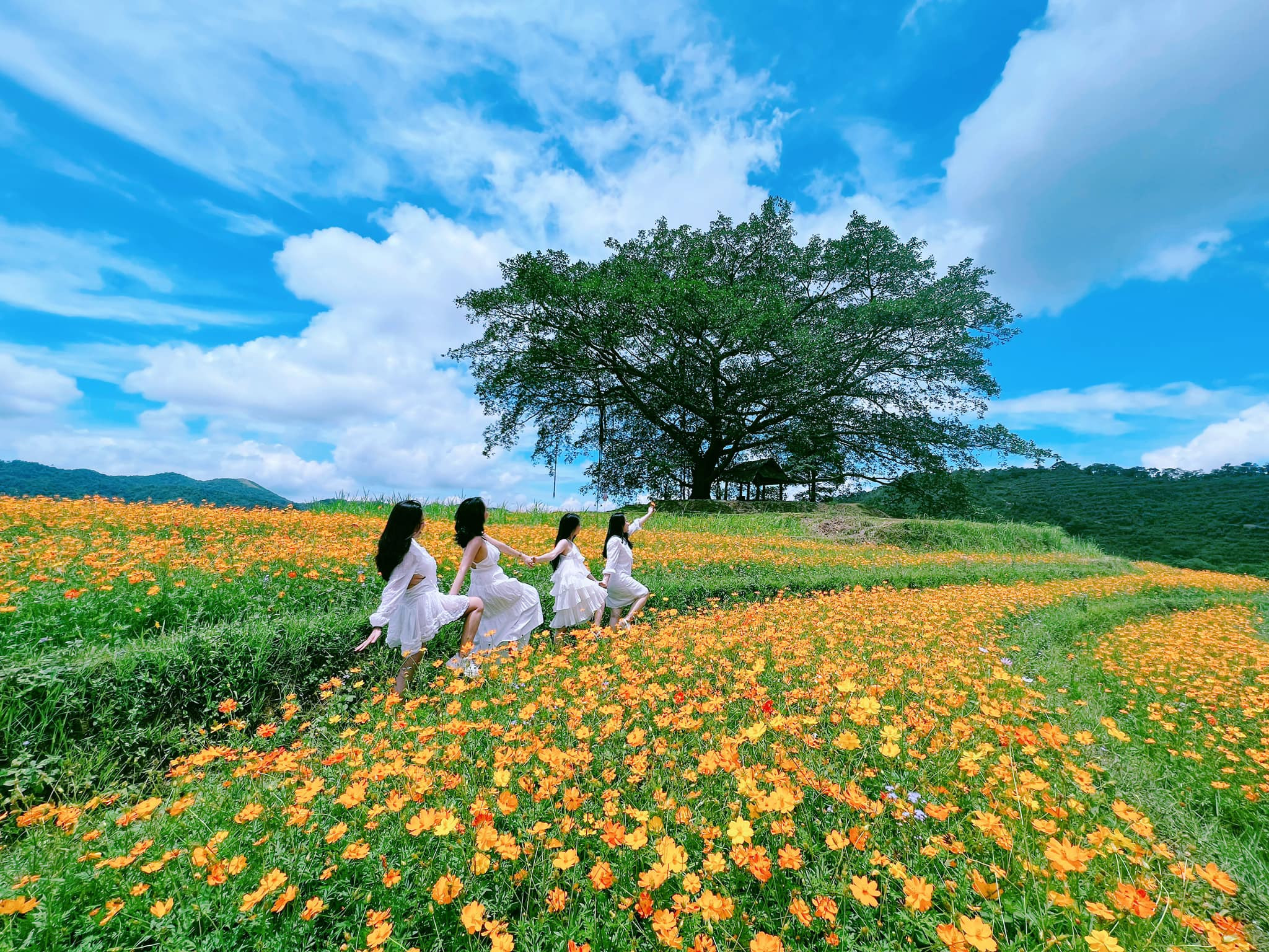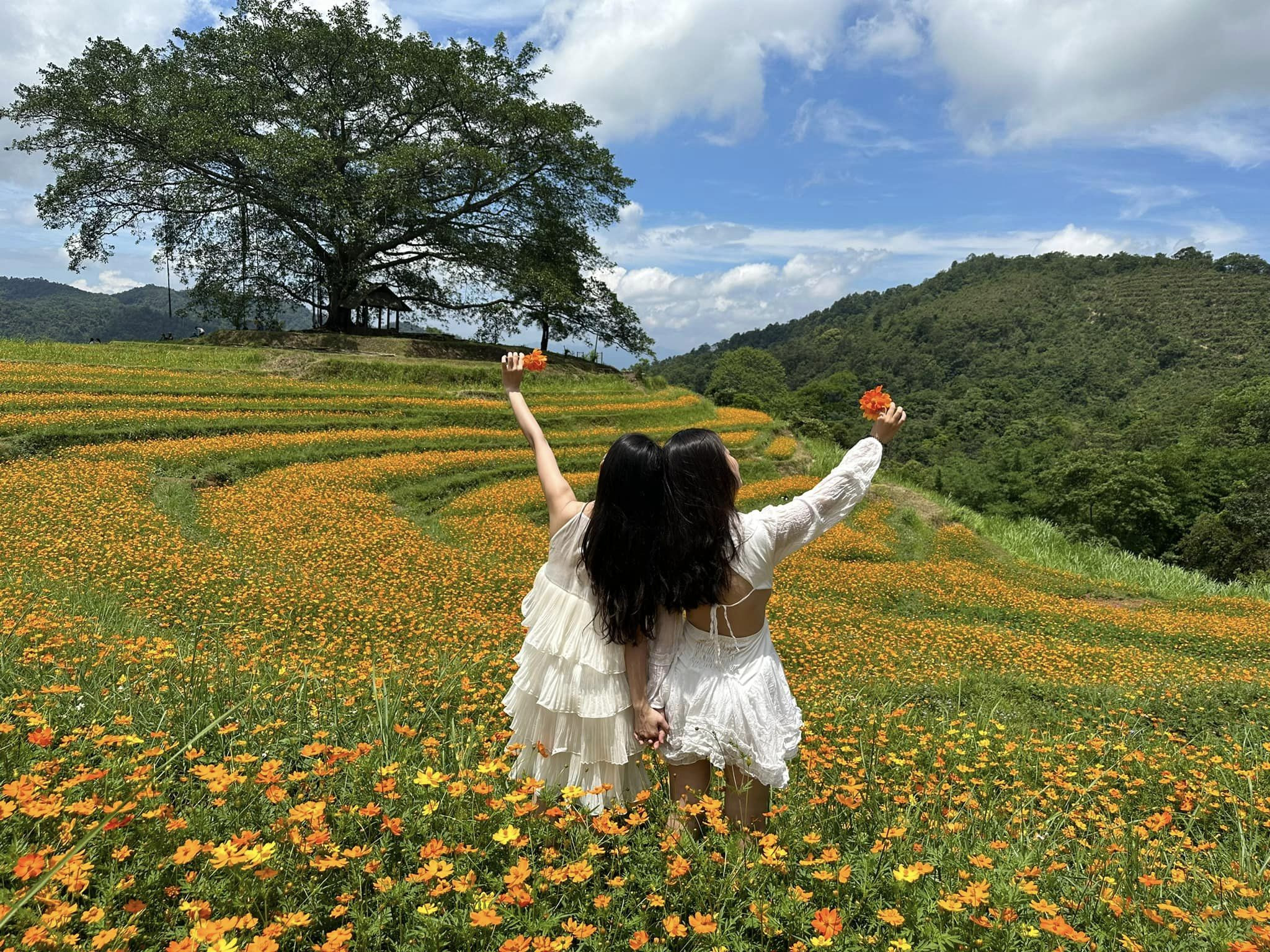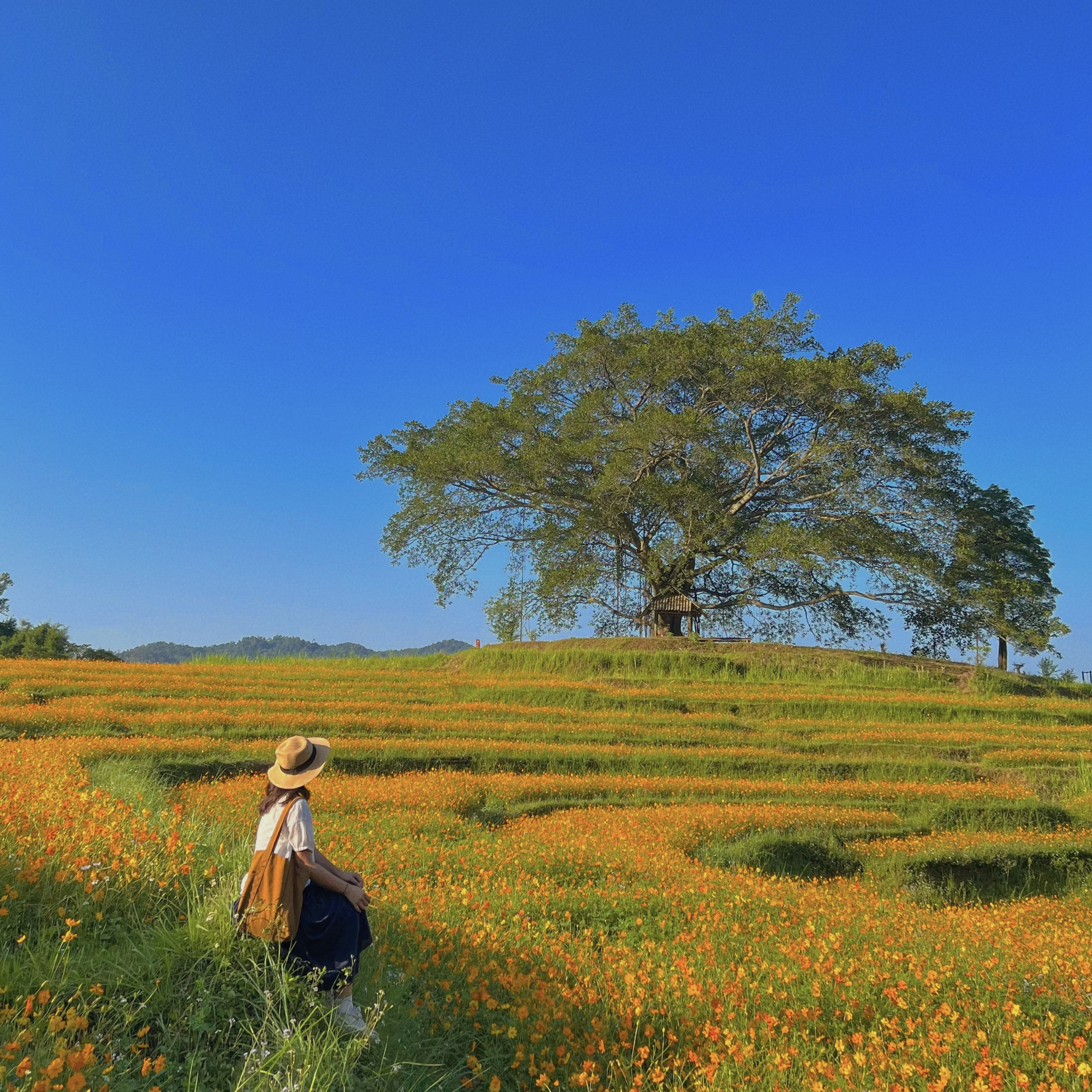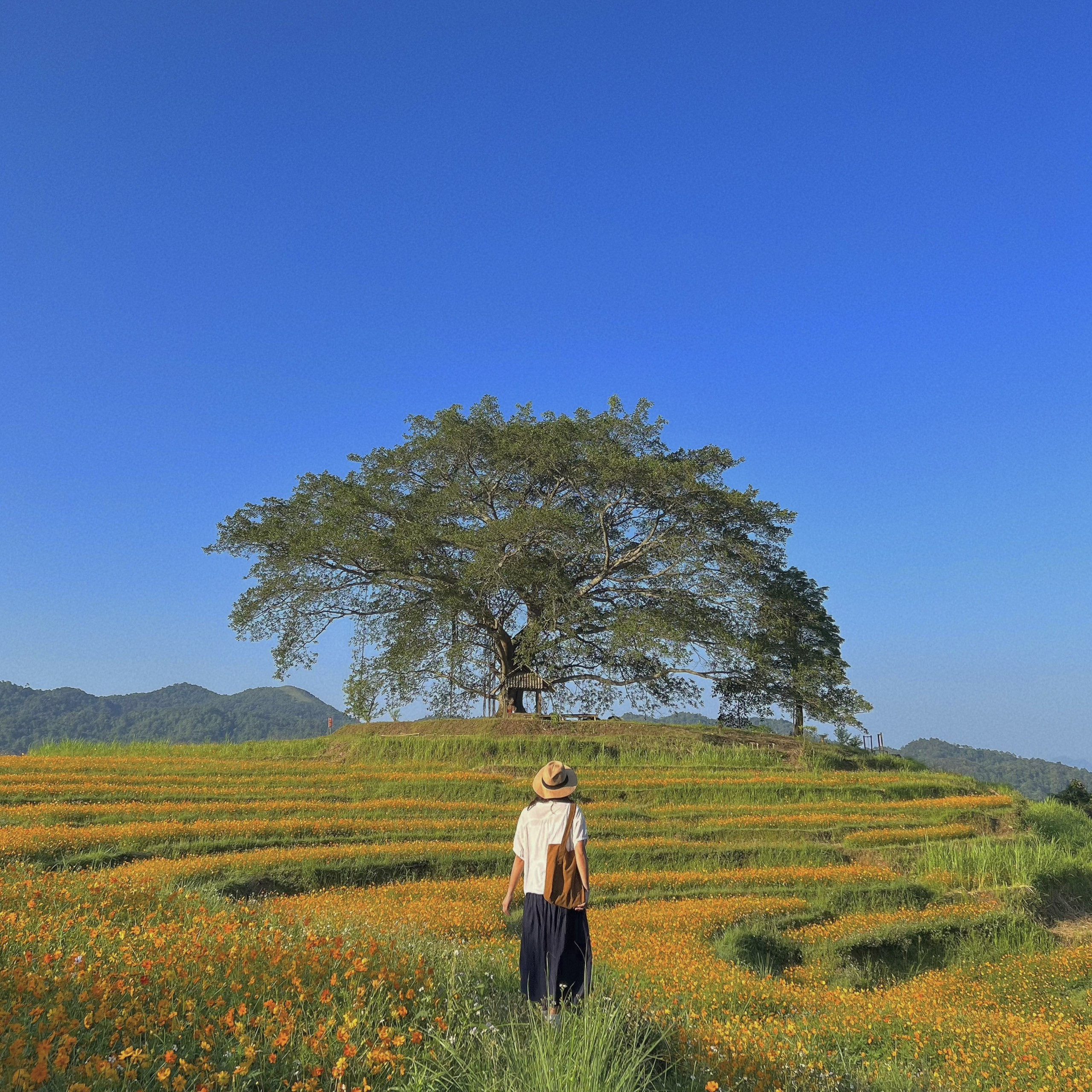 Bạn Trang Phạm (sinh năm 1999) cho biết, người dân ở xóm Mừng mới trồng thêm hoa trên những thửa ruộng bậc thang để làm du lịch, nên du khách tới đây sẽ mua vé với giá 30 nghìn đồng/người. Bên cạnh đồi hoa, ở đây cũng có dịch vụ ăn, nghỉ cho khách du lịch. Ảnh: Trang PhạmĐiểm nhấn đặc biệt chính là cây đa cổ thụ tán rộng vài chục mét, đây được coi là biểu tượng trong đời sống tâm linh của người Mường ở bản Mừng. Ảnh: Trang PhạmLà địa điểm "mới nổi" trên bản đồ du lịch, nên nơi đây vẫn không quá đông đúc. Không gian rộng cũng giúp du khách dễ dàng có được những bức ảnh check-in siêu đẹp. Ảnh: Hoài Anh