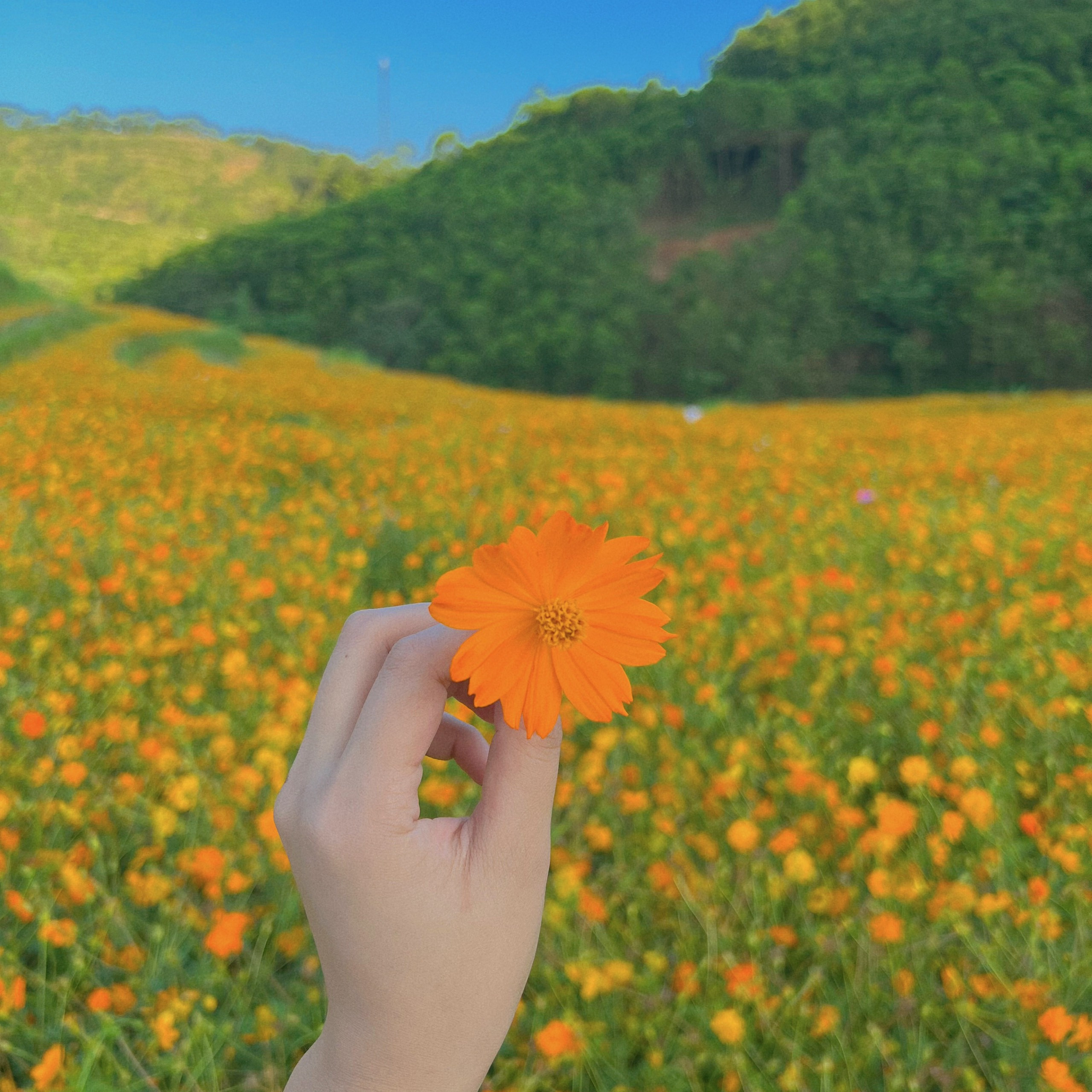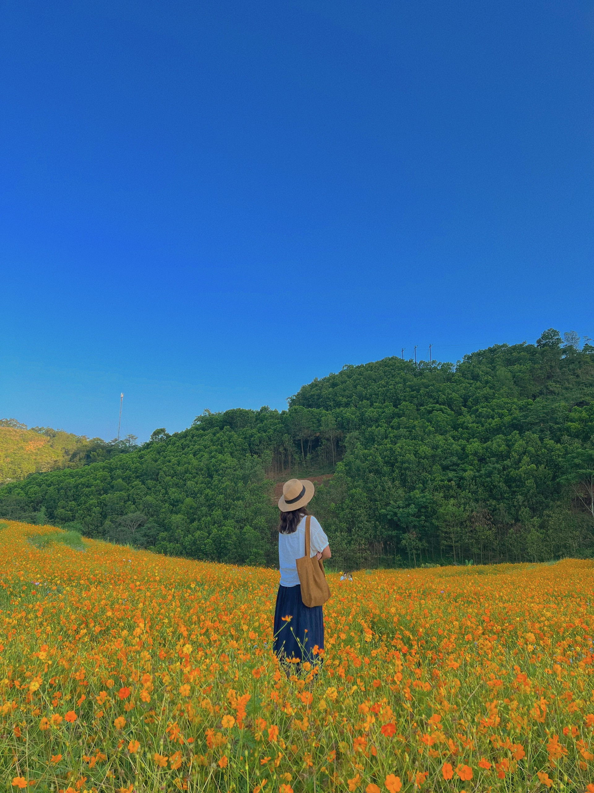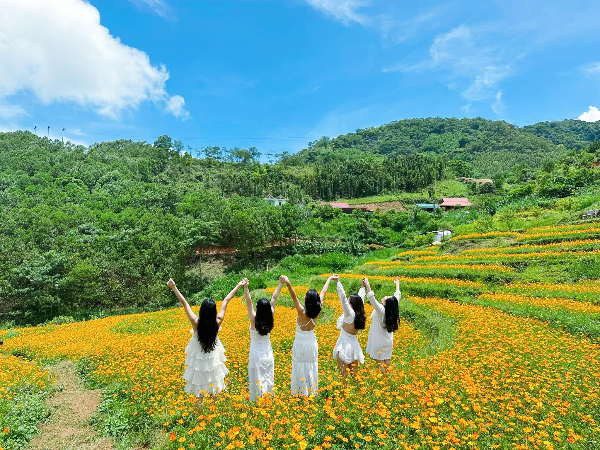 Khu ruộng bậc thang của xóm Mừng rộng khoảng 4ha. Năm nay, người dân tận dụng những thửa ruộng này để trồng hoa cánh bướm. Từng tầng hoa cam vàng rực rỡ xếp nối lên nhau, đung đưa trong gió. Xa xa là dãy núi trùng điệp và bầu trời xanh ngắt, tất cả tạo nên khung cảnh như cổ tích.