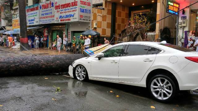 Khoảng 15h30, tại khu vực quận 5, 10 có mưa dông lớn kèm theo gió giật mạnh. Cây xà cừ cổ thụ có đường kính khoảng 1 mét, cao gần 30 mét trước nhà số 323 An Dương Vương bị quật ngã, đổ sập ngang đường.