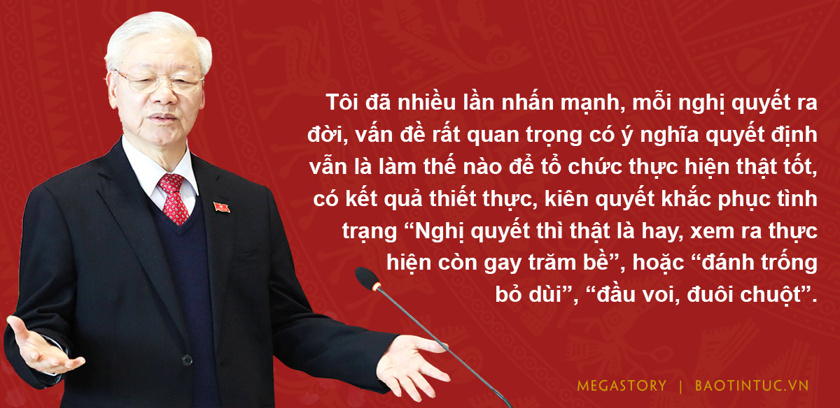 Tôi đã nhiều lần nhấn mạnh, mỗi nghị quyết ra đời, vấn đề rất quan trọng có ý nghĩa quyết định vẫn là làm thế nào để tổ chức thực hiện thật tốt, có kết quả thiết thực, kiên quyết khắc phục tình trạng “Nghị quyết thì thật là hay, xem ra thực hiện còn gay trăm bề”, hoặc “đánh trống bỏ dùi”, “đầu voi, đuôi chuột”.