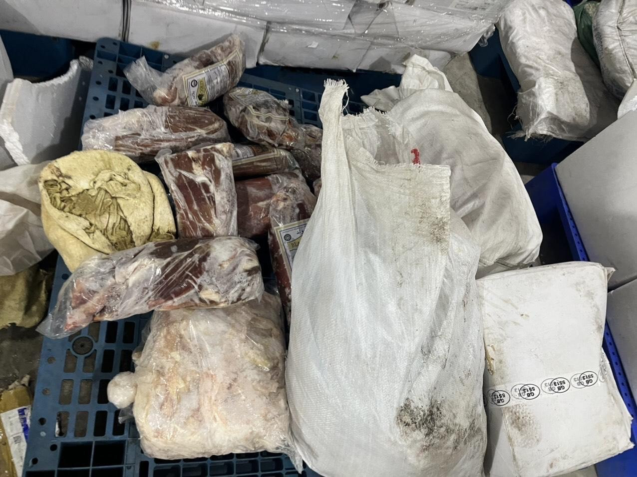 Tại 2 kho hàng của công ty này là các sản phẩm gồm: thịt gà, bò, các loại nội tạng động vật,... Tất cả đều không có tem nhãn, giấy chứng nhận hợp chuẩn hợp quy, trong đó có nhiều thực phẩm có hiện tượng bốc mùi hôi thối. Một số thùng và bao bì có ghi bằng tiếng nước ngoài.