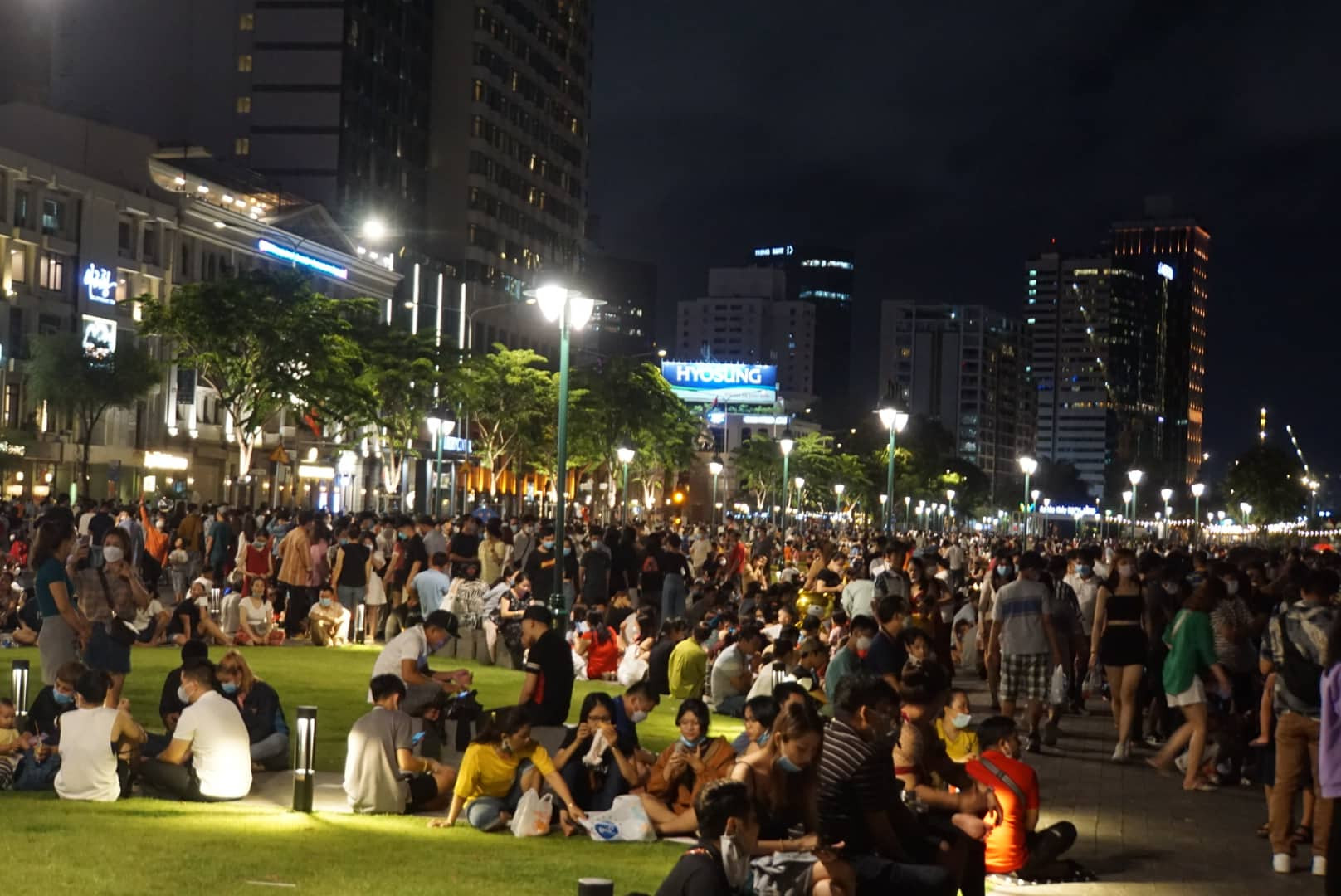 Lúc 19h30, người dân TP.HCM đổ về các điểm vui chơi khu trung tâm như phố đi bộ Nguyễn Huệ, công viên Bến Bạch Đằng, khu vực đường sách, các điểm ăn uống, trung tâm thương mại... để vui chơi và chờ xem bắn pháo hoa. Các tuyến đường giao thông vào trung tâm trong tình trạng đông đúc.