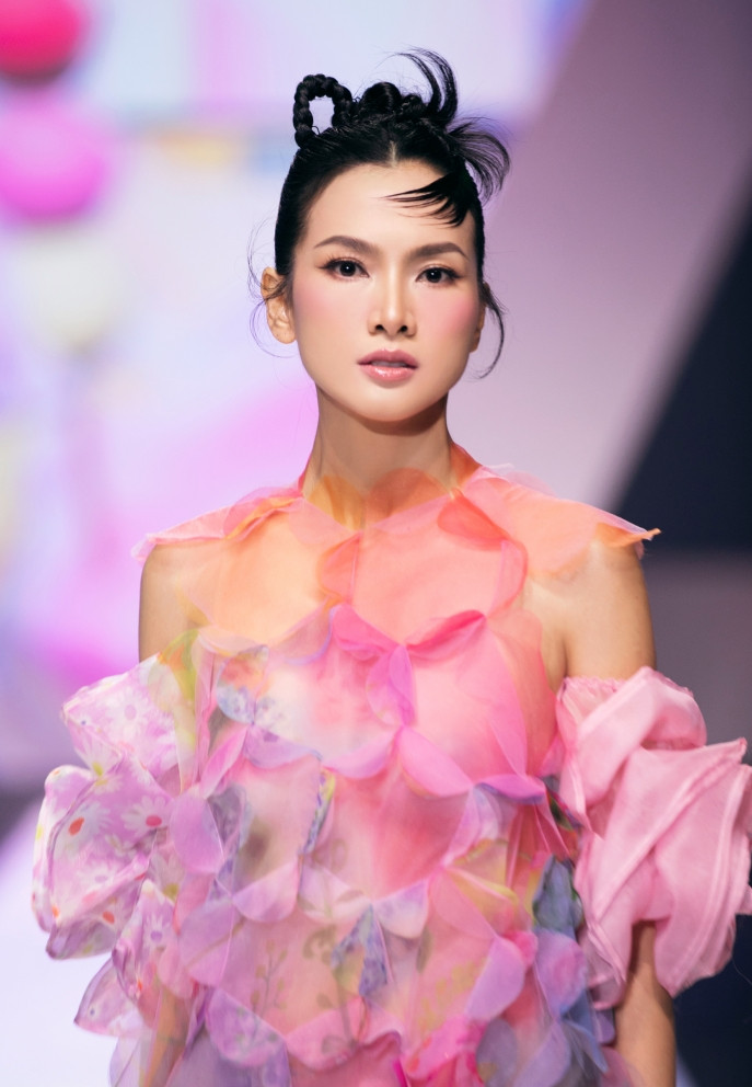 Anh Thư thể hiện tinh thần BST Leaf Xia. Trang phục nữ siêu mẫu mặc vốn không có lợi thế tôn chiều cao của cô, thậm chí còn ‘dìm’. Tuy nhiên, kinh nghiệm và bản lĩnh sân khấu giúp cô thu hút người xem. Vừa catwalk, thỉnh thoảng siêu mẫu còn nở nụ cười tươi - vốn là lợi thế của cô - để tương tác với mọi người.