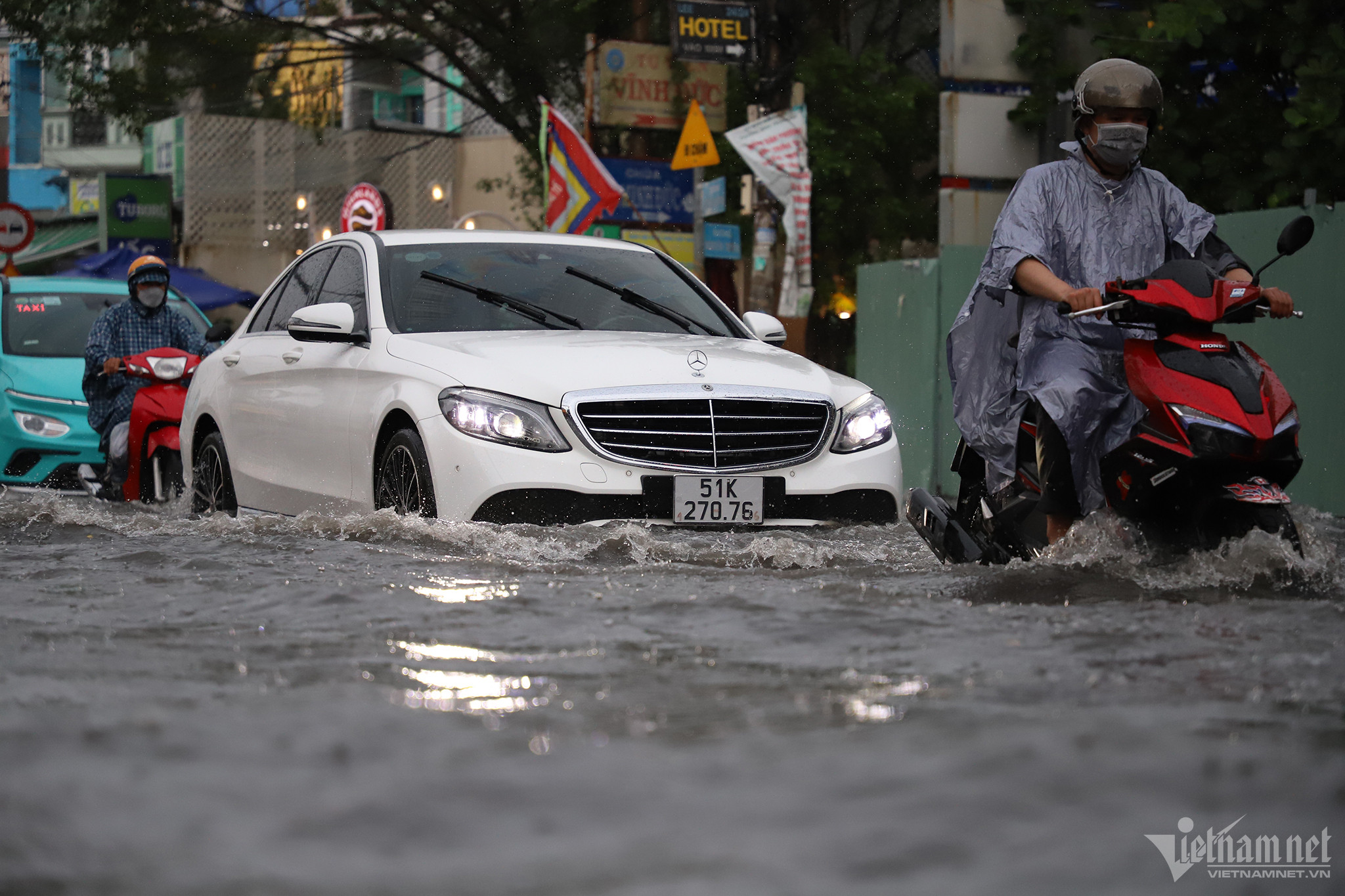Anh Bảo và bạn cố gắng đẩy chiếc xe chết máy vào khu vực ít ngập nước. "Thật ngán ngẩm với tình trạng ngập tại TP.HCM trong những ngày vừa qua. Hễ mưa lớn, kéo dài khoảng 1 giờ là nước ngập lênh láng", anh Bảo nói.