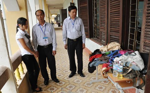 Chánh thanh tra Bộ GD-ĐT Nguyễn Huy Bằng (ở giữa) nhắc nhở nữ giám thị không để túi đồ của thí sinh gần phòng thi.