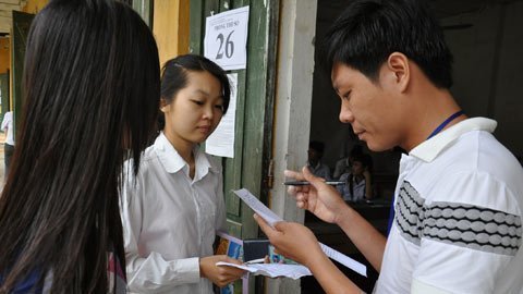 Giám thị xem tên, đối chiếu thẻ và CMND của thí sinh trước khi cho vào phòng thi.