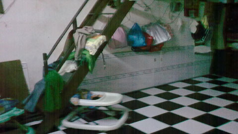 Căn nhà áng chừng chưa được tới 15 mét vuông, khắp nơi giăng đầy quần áo. Bày giữa nhà là một cái võng, một cái xe tập đi của em bé. Mấy chiếc bình sữa của bé được treo trên tường nứt nẻ, nổi mốc đen.