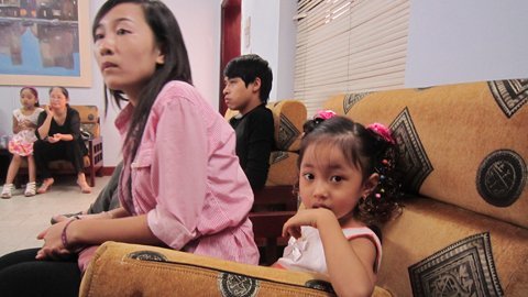 | Cô bé mới ở độ tuổi mẫu giáo được bà (áo đen, ngồi thứ hai từ trái qua) dẫn đến phòng tuyển vai. |