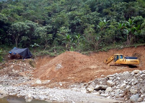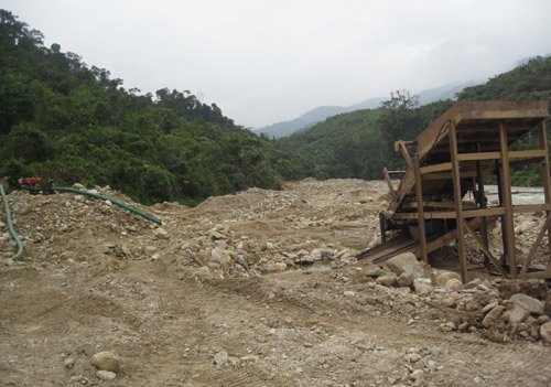 Những chiếc xe xúc, xe ủi ầm ì nhả khói gầm rú, sục sạo đào bới đất đá dưới lòng sông rồi đưa lên máy xay và qua sàng tuyển quặng vàng.