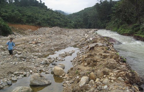 Từ trên sườn dốc cheo leo giữa rừng thẳm, theo tay chỉ của người dẫn đường, đại công trường khai khoáng và khai thác rừng hiện ra dọc theo sông Lon thuộc địa bàn thôn 3 xã Trà Ka giống như bãi chiến trường bị bom B52 rải thảm những năm chiến tranh.